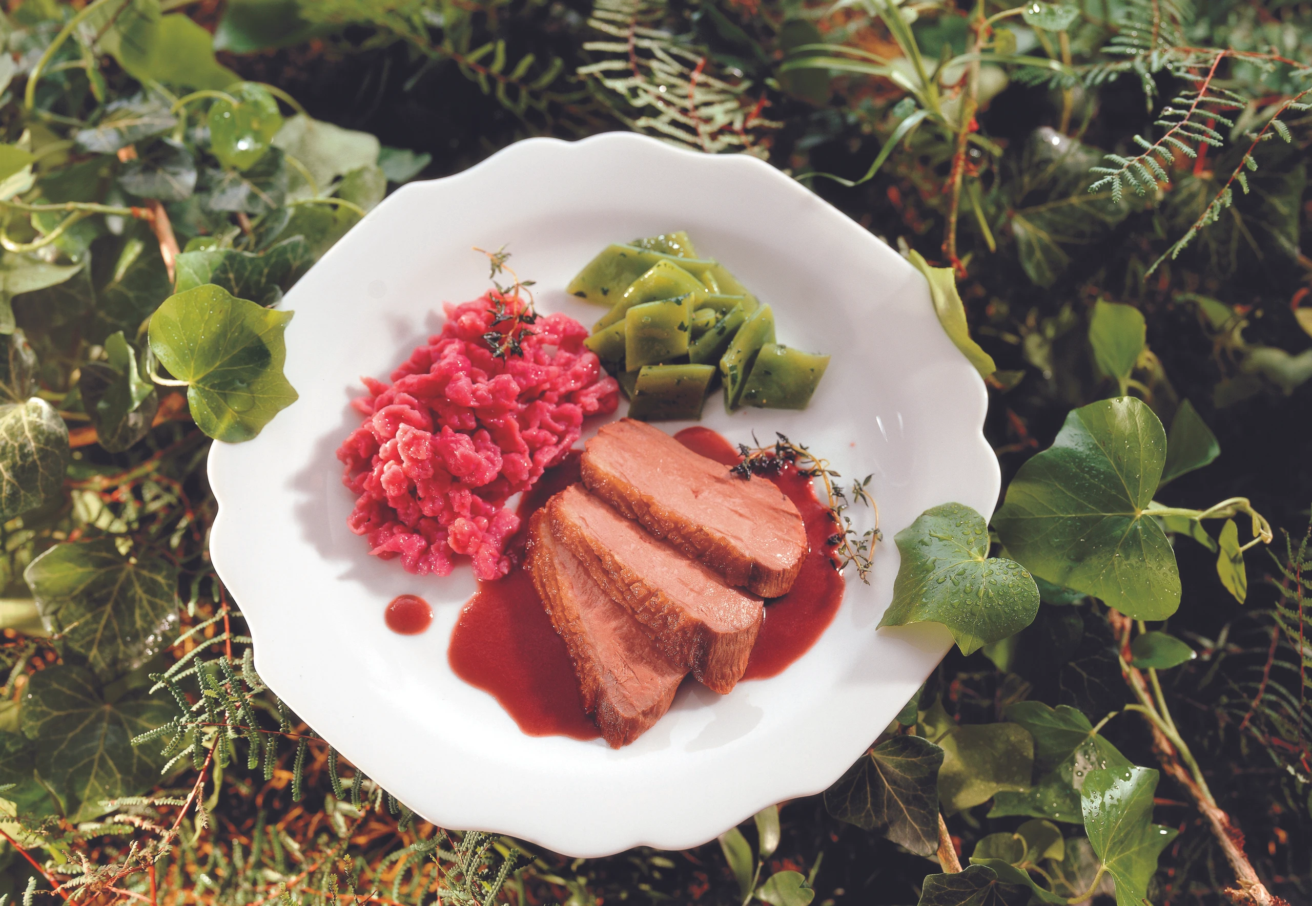 Kirschensauce mit einem Stabmixer fein pürieren, durch ein Sieb passieren und mit dem Bratensaft vermischen.