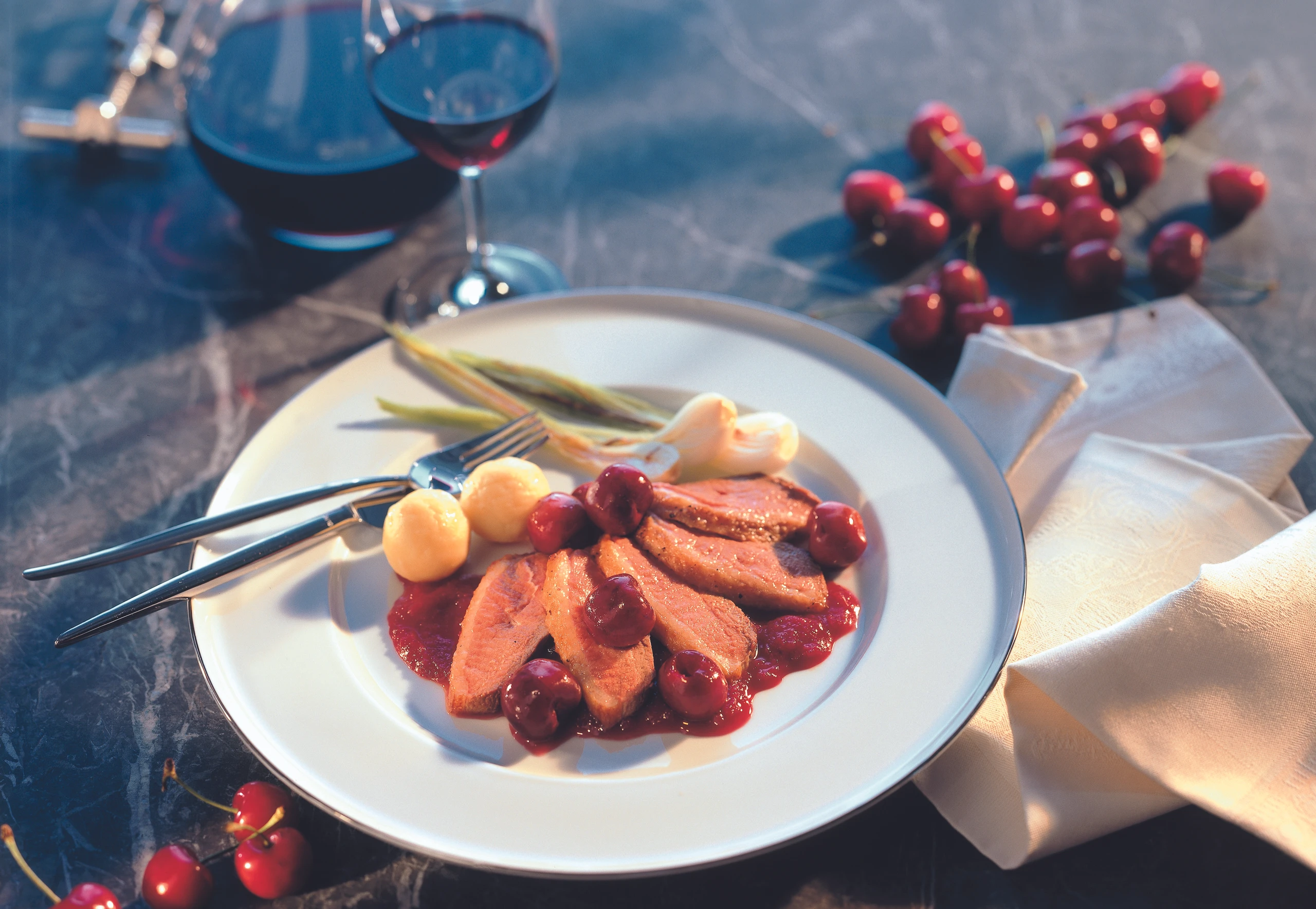 Entenbrüste quer zur Faser in ca. 1/2 cm dicke Scheiben schneiden, mit der Kirschensauce und den Beilagen anrichten.