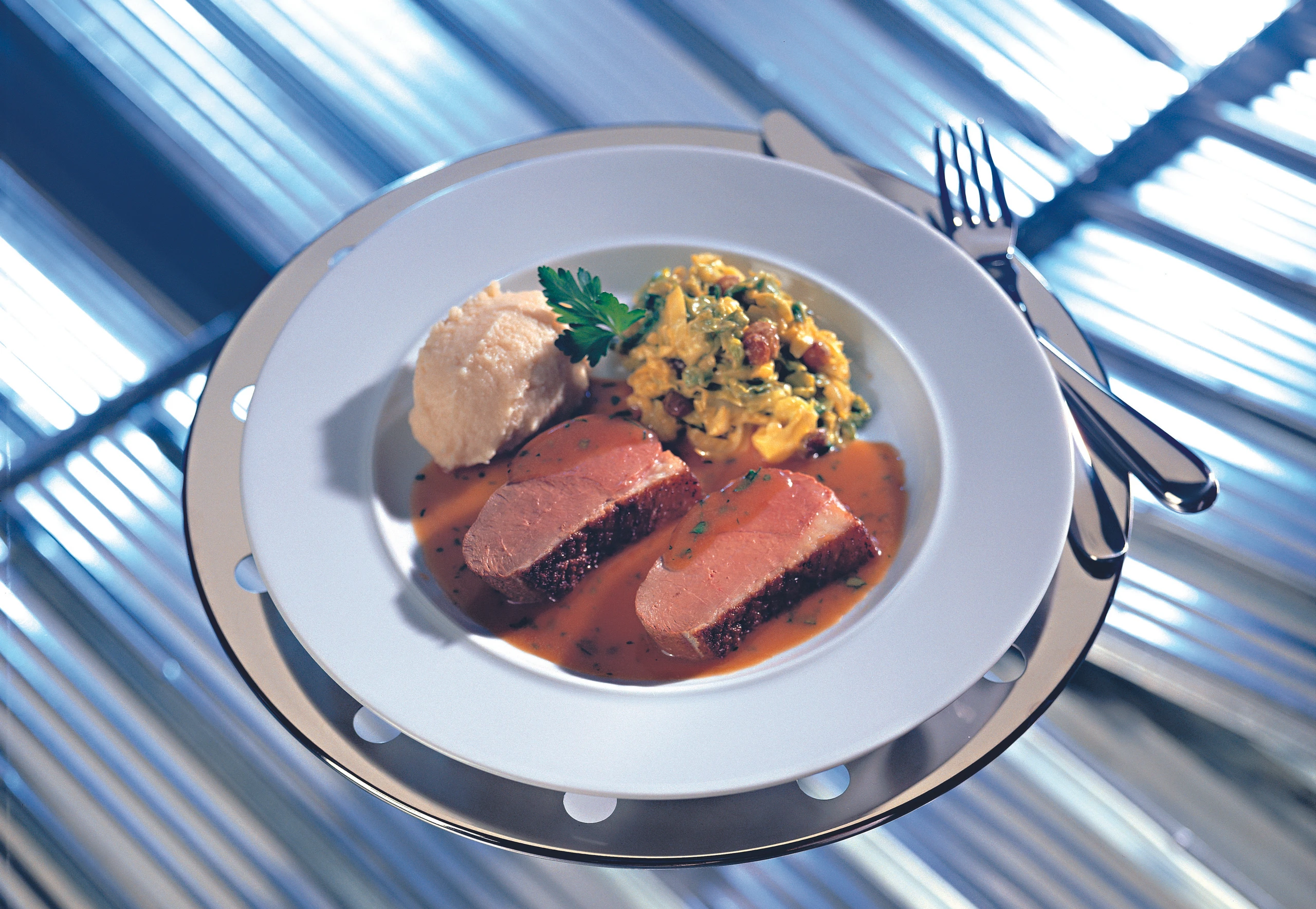 Entenbrust quer zur Faser in Scheiben schneiden und mit dem Saft und den Beilagen (siehe Rezepte) auf Tellern anrichten.