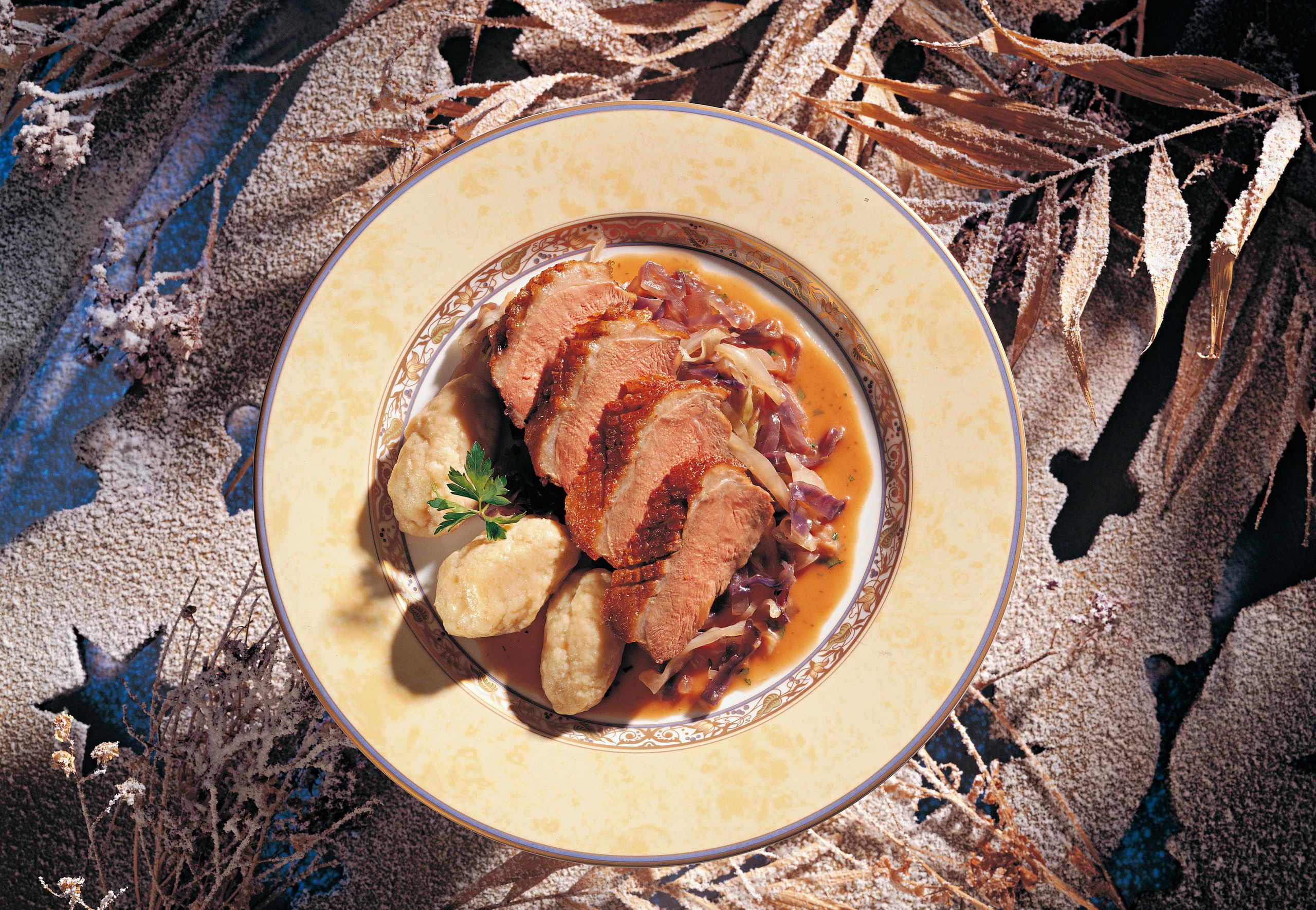 Gebratene Entenbrust mit Rahmnockerln und Rot-Weiss-Kraut