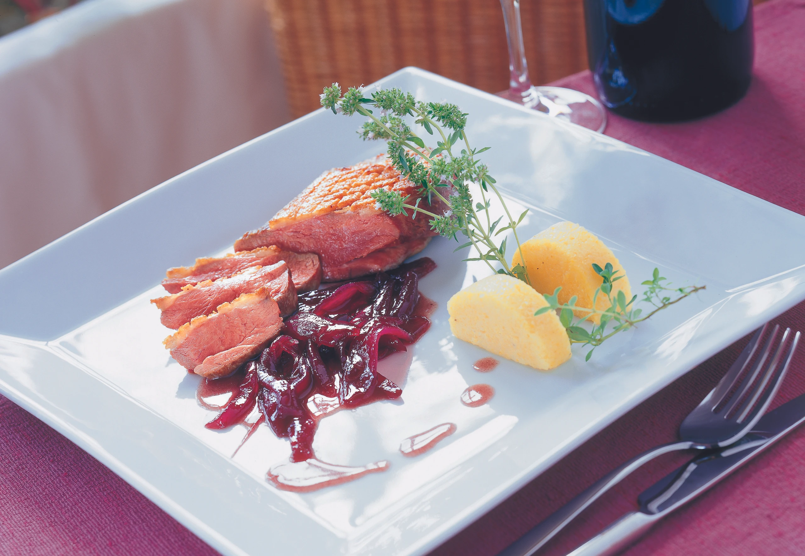 Gebratene Entenbrust auf Rotweinzwiebeln mit Sterzterrine
