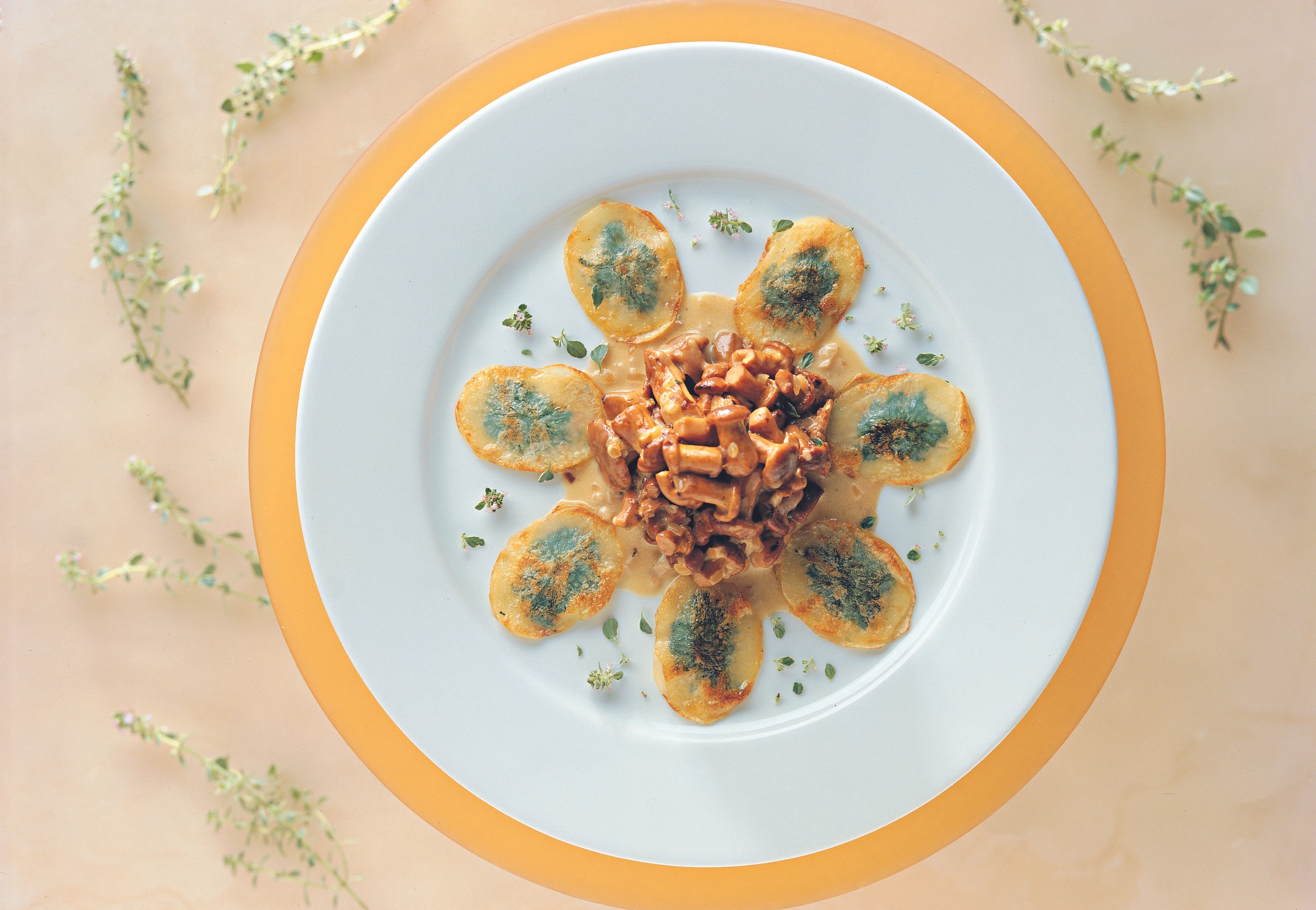 Gebratene Erdäpfelravioli mit Kräutern und Eierschwammerln