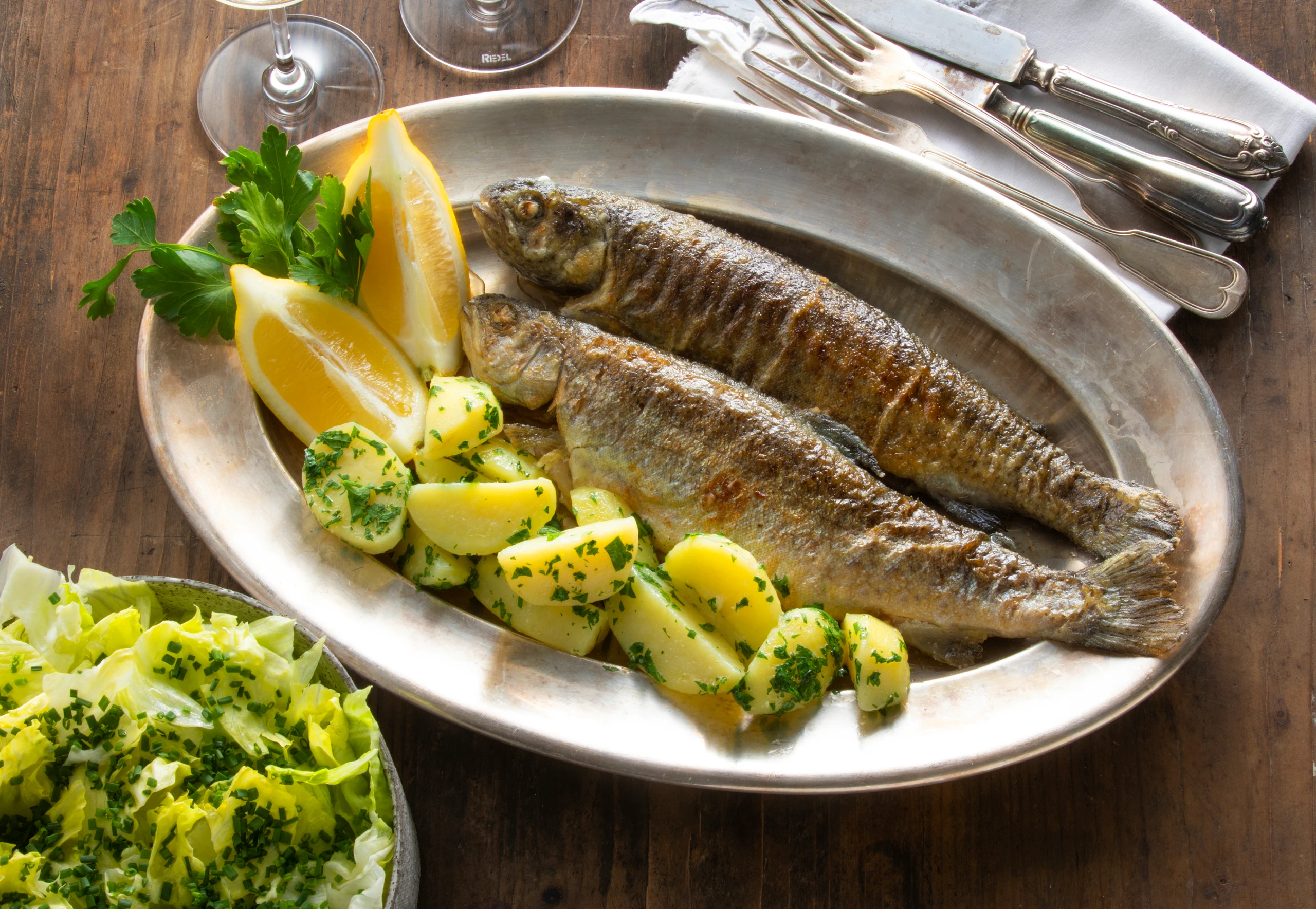 Forellen waschen und trockentupfen. Fische innen und außen salzen und in der Speisestärke wenden. Öl in einer Pfanne erhitzen und die Forellen beidseitig knusprig braten.