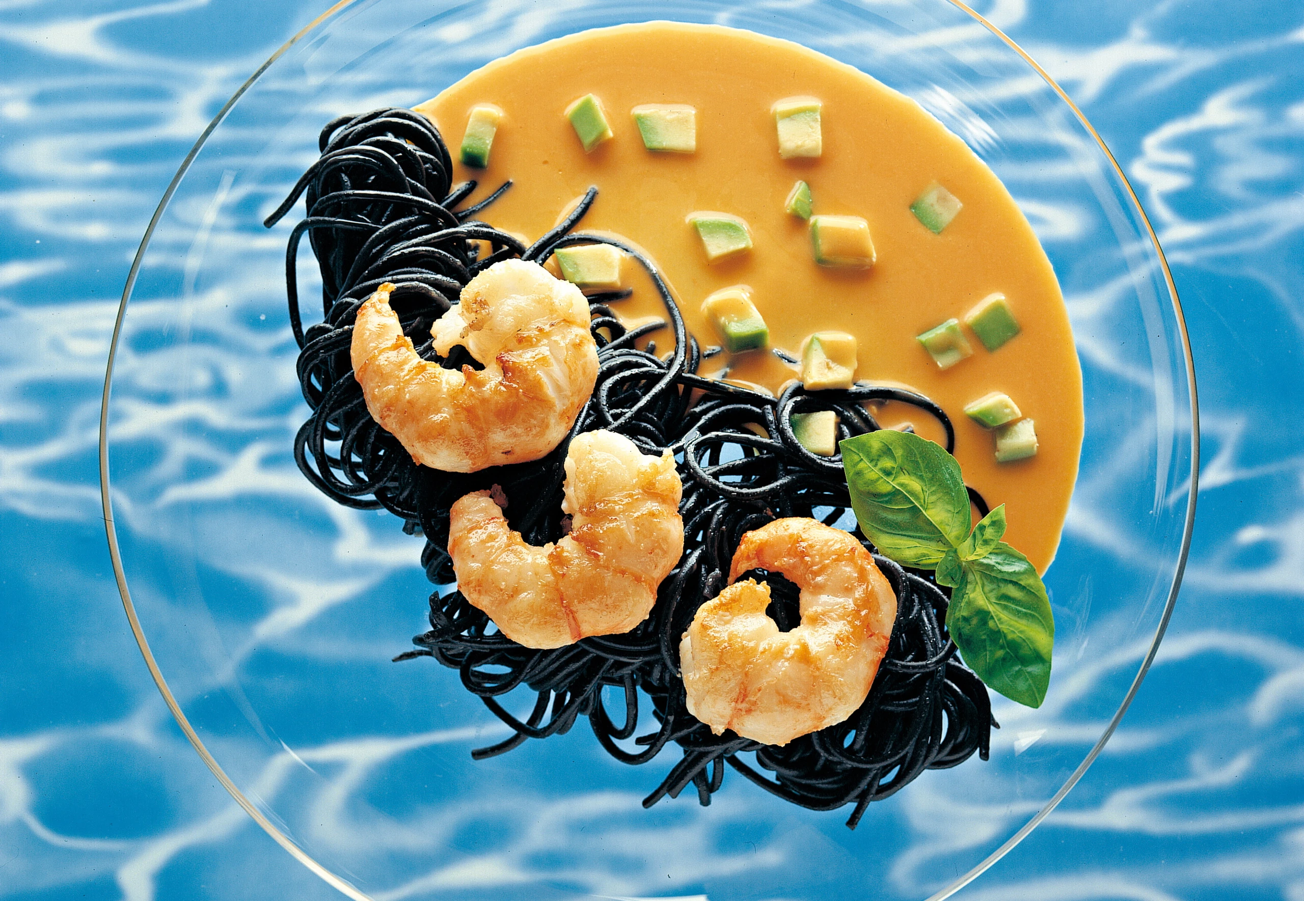 Bratrückstand mit Hummersuppe ablöschen und aufkochen, Weinbrand und Avocadowürfel untermischen. Garnelen dekorativ mit den Nudeln und der Sauce anrichten und rasch servieren.