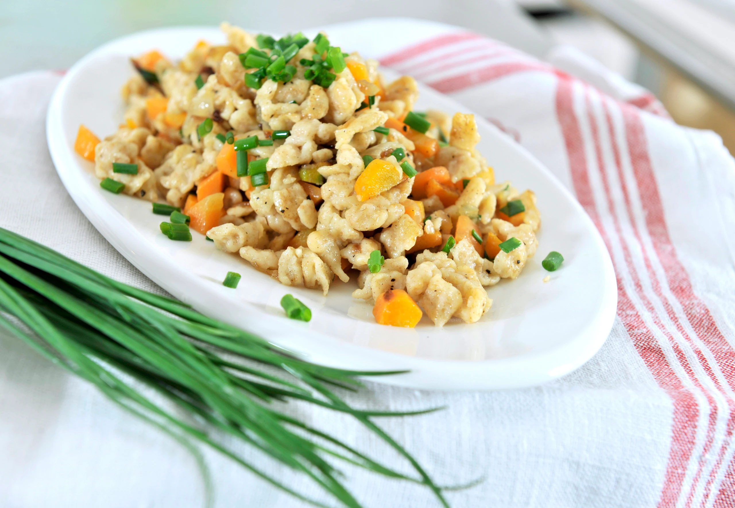 Zwiebeln und Karotten schälen. Zwiebeln hacken, Karotten klein schneiden. Zwiebeln im Öl goldgelb rösten, Karotten zugeben und mitbraten. Spätzle untermischen, unter Rühren mitbraten, mit Salz und Pfeffer würzen.