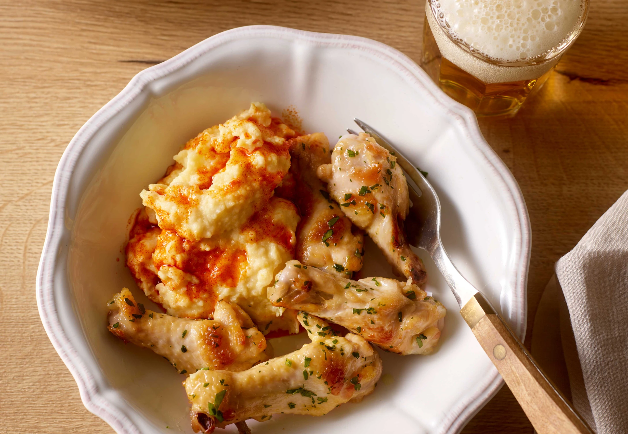 Flügerl auf Tellern anrichten. Püree mit Paprikaöl beträufeln und mit den Flügerln servieren.