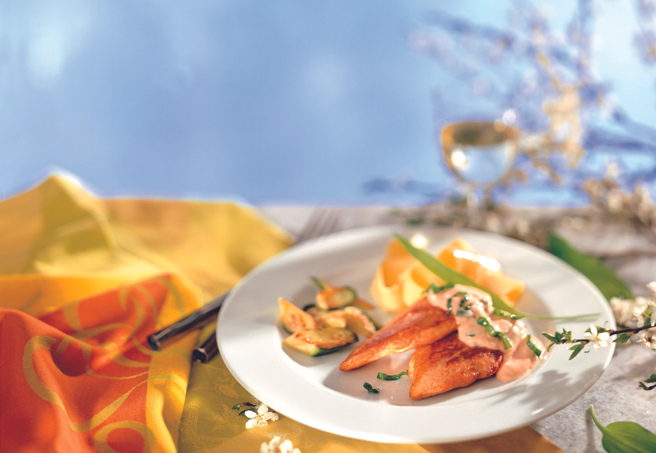Hühnerfilets aus der Pfanne nehmen und in die Sauce legen, 2–3 Minuten darin ziehen lassen. Bärlauch in feine Streifen schneiden und untermischen. Hühnerfilets mit der Sauce und dem Zucchinigemüse (siehe Rezept) anrichten. Als zusätzliche Beilage passen breite Bandnudeln.