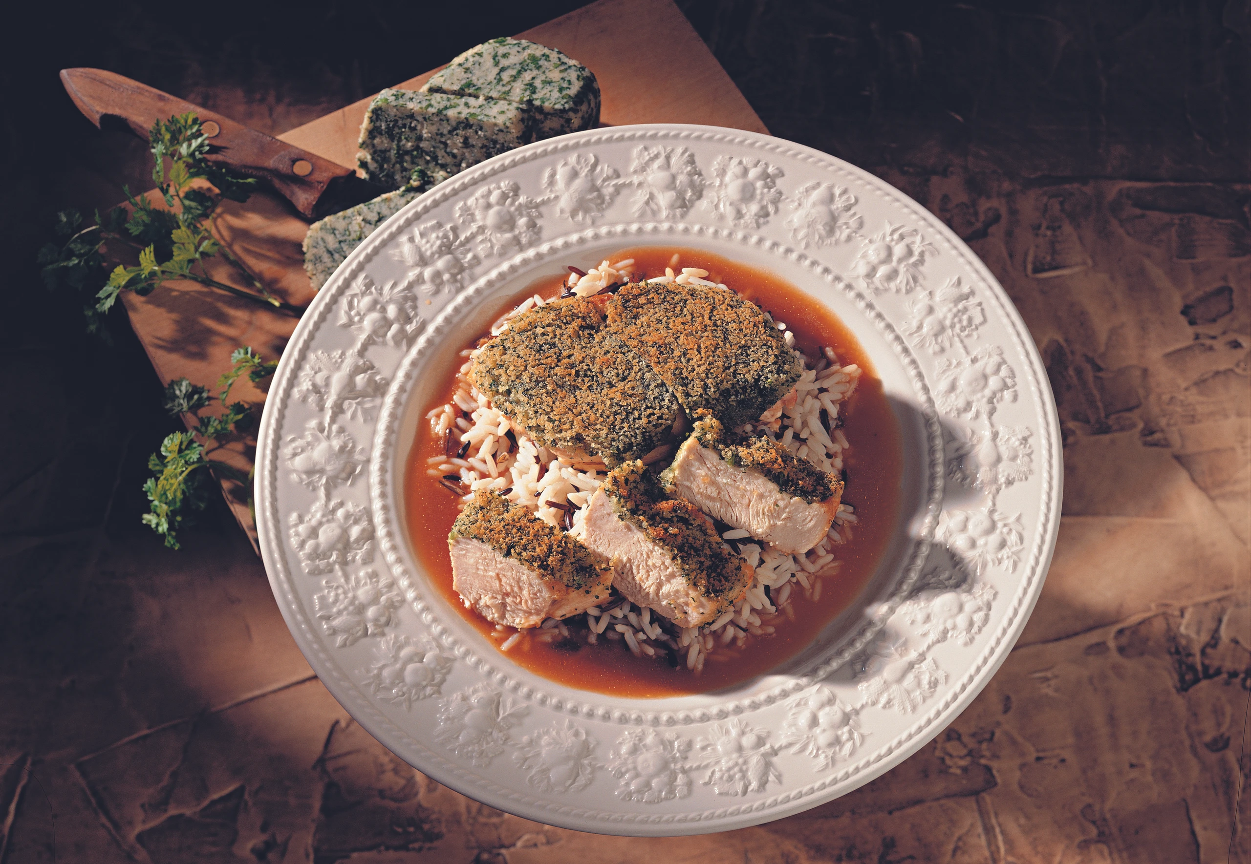 Hühnerbrüste aus dem Rohr nehmen, in schräge Scheiben schneiden und mit der Sauce anrichten. Als Beilagen serviert man Reis und Gemüse.