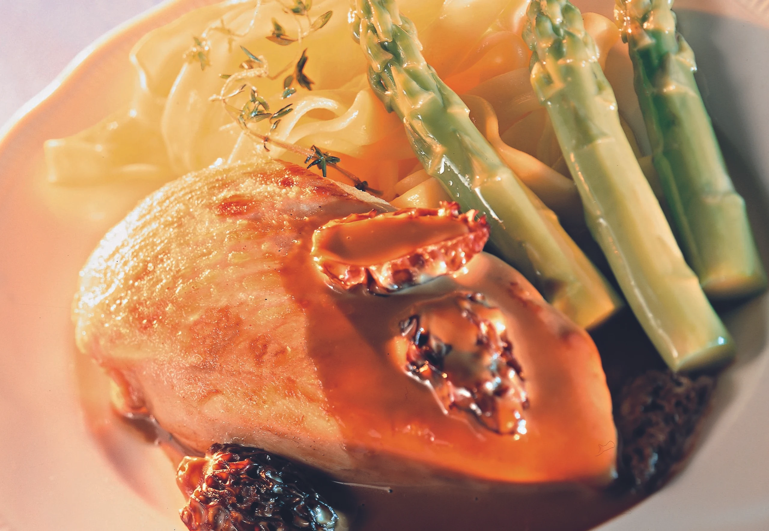 Gebratene Hühnerbrust mit Spargel und Morchelsauce