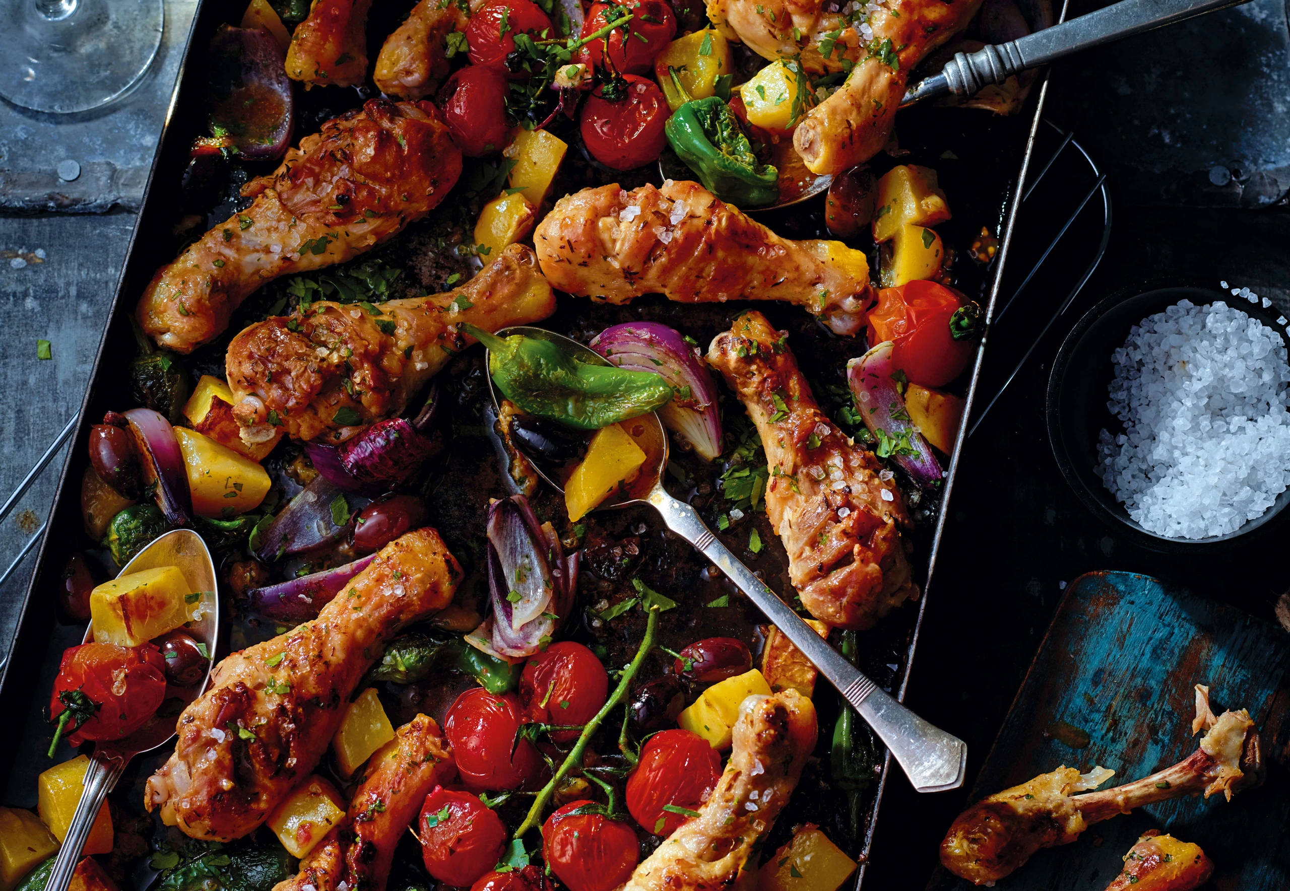 Gebratene Hühnerkeulen mit Gemüse, Erdäpfeln und Oliven
