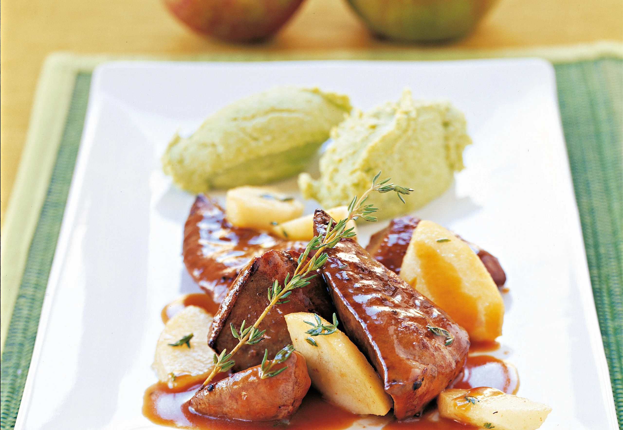 Apfelscheiben und Apfelbrand untermischen und kurz mitköcheln. Leber einlegen, kurz ziehen lassen und mit dem Erbsenpüree anrichten.