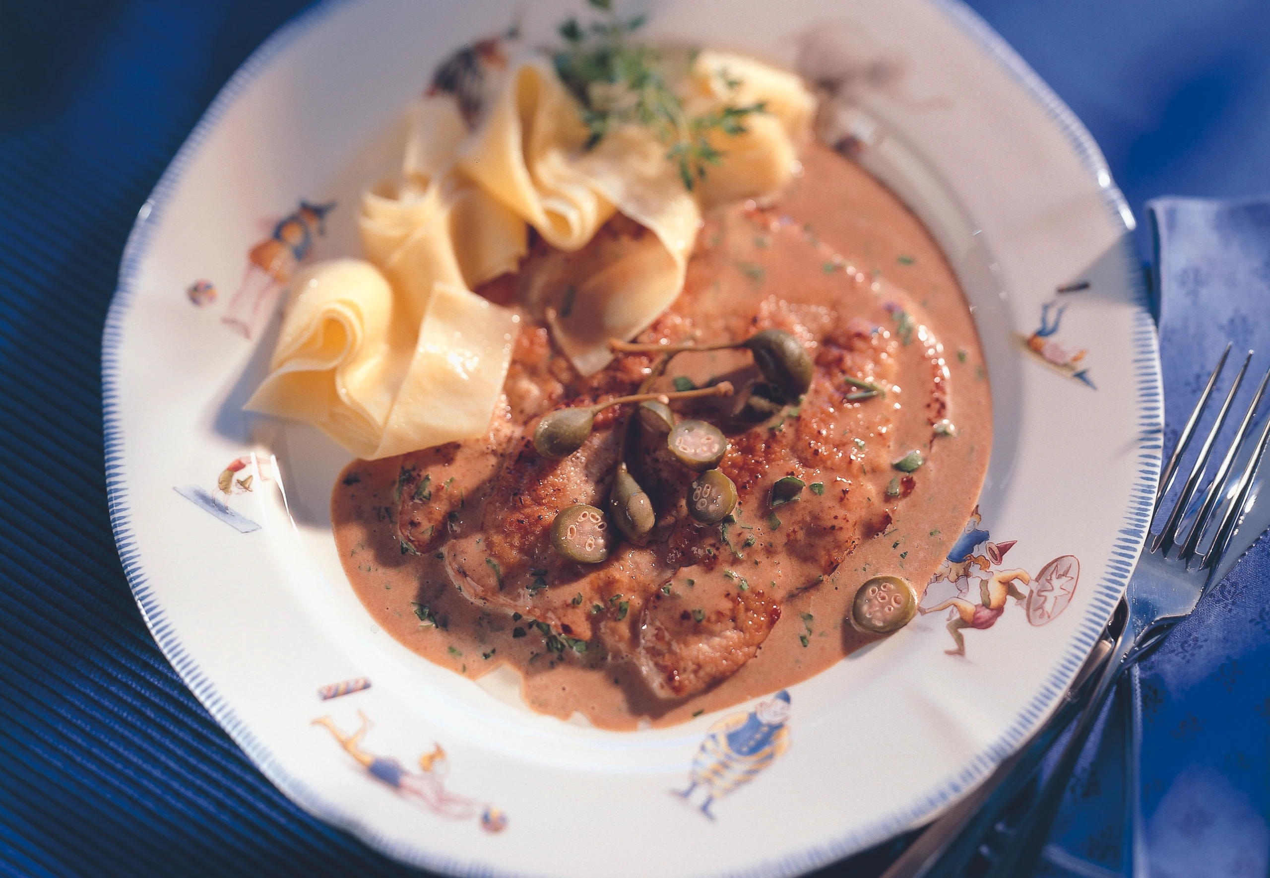 Gebratene Kalbsschnitzel mit Kapern-Rahmsauce und Bandnudeln