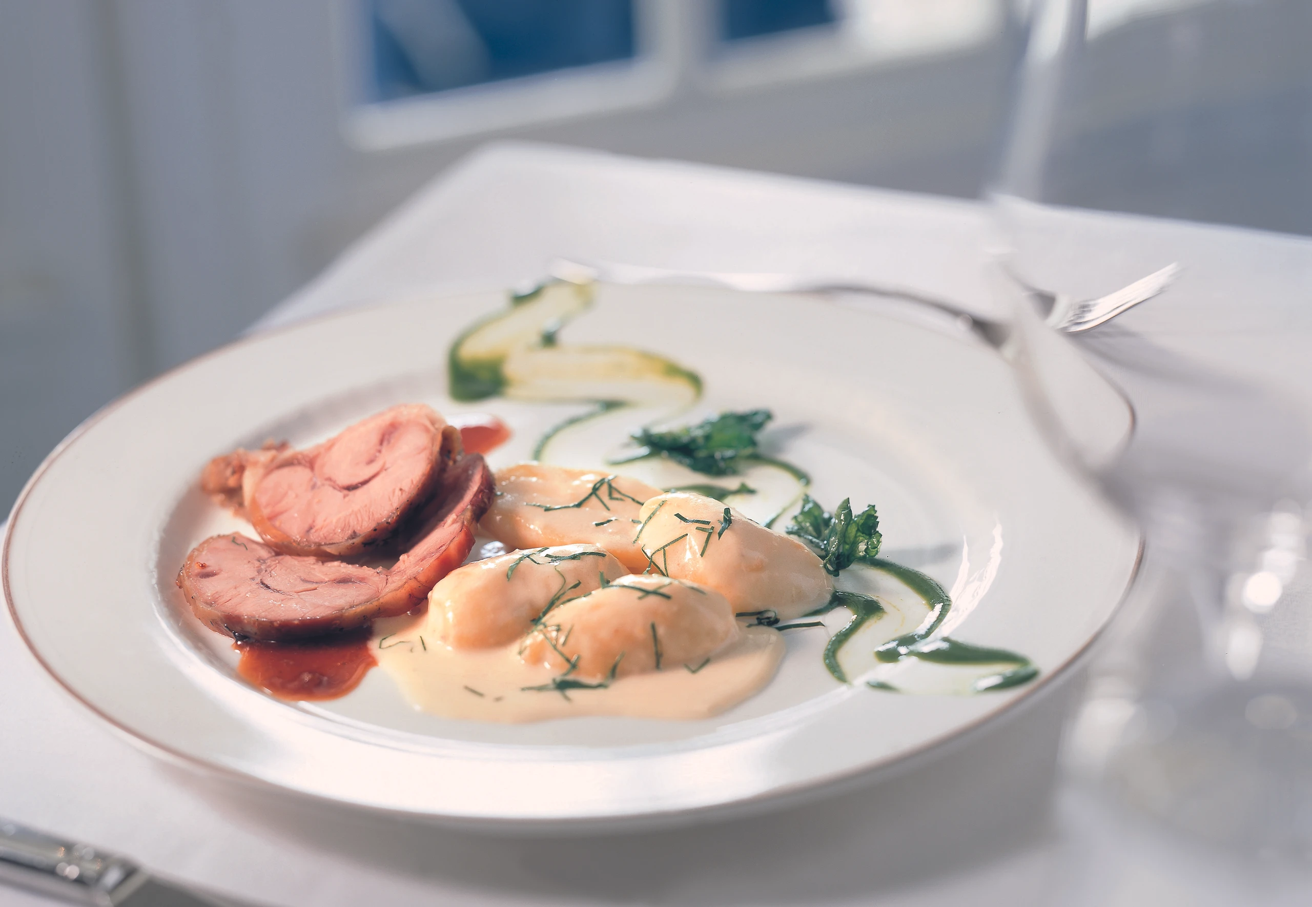 Vor dem Servieren helle Sauce aufkochen, Erdäpfel untermischen, erwärmen und mit Petersilstreifen bestreuen. Erdäpfel und grüne Petersilsauce anrichten.