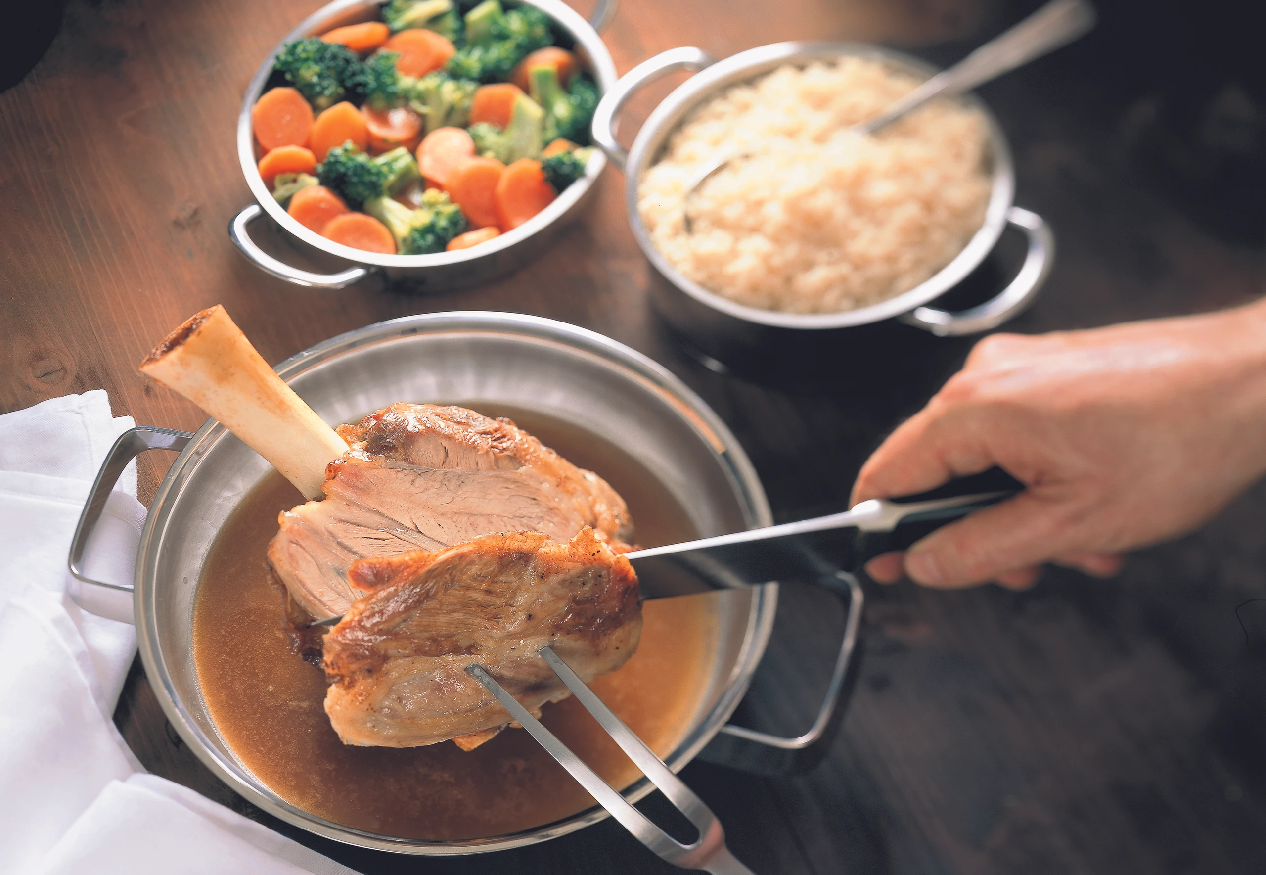 - Stelzen aus der Pfanne heben und zum Rasten zugedeckt warm stellen. Den Bratensaft (ca. 375 ml; eventuell mit Suppe ergänzen) durch ein Sieb gießen und bei schwacher Hitze ca. 3 Minuten einkochen. Stelzen tranchieren und mit dem Saft und den Beilagen servieren.