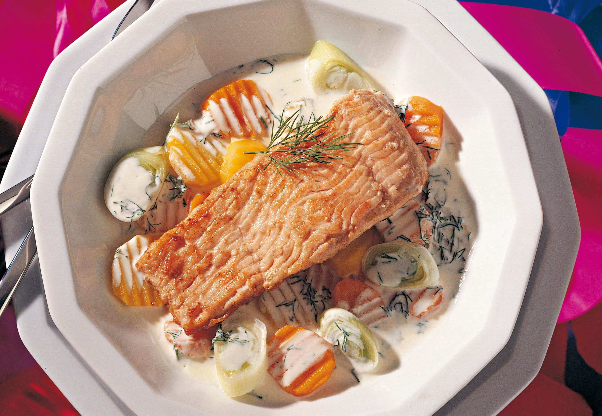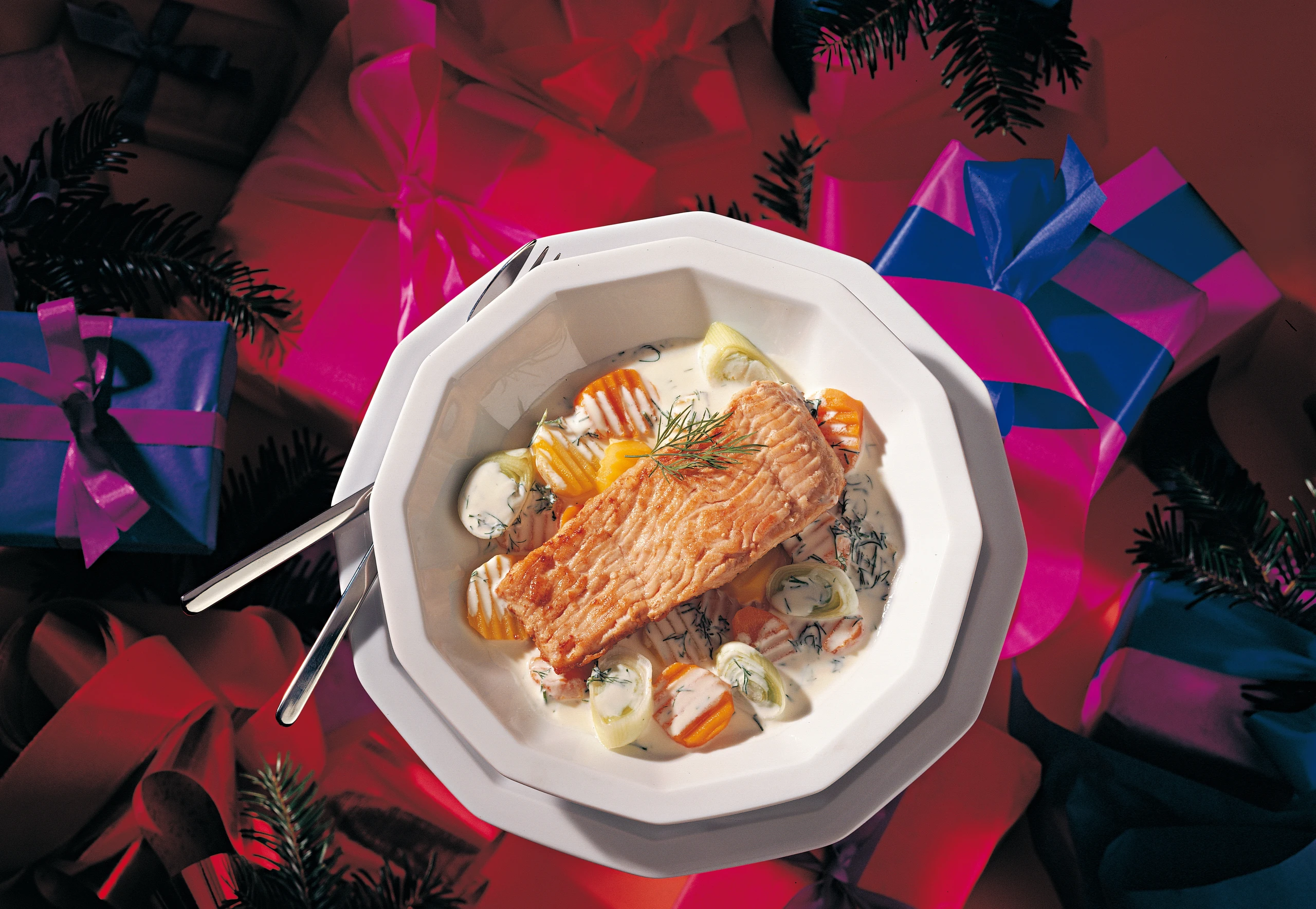 Parallel dazu Sauce mit Salz und Pfeffer würzen, Gemüse und Dille zugeben und erwärmen. Sauce in tiefen Tellern anrichten, Karpfenfilets daraufsetzen und mit Dillzweigen garniert servieren.