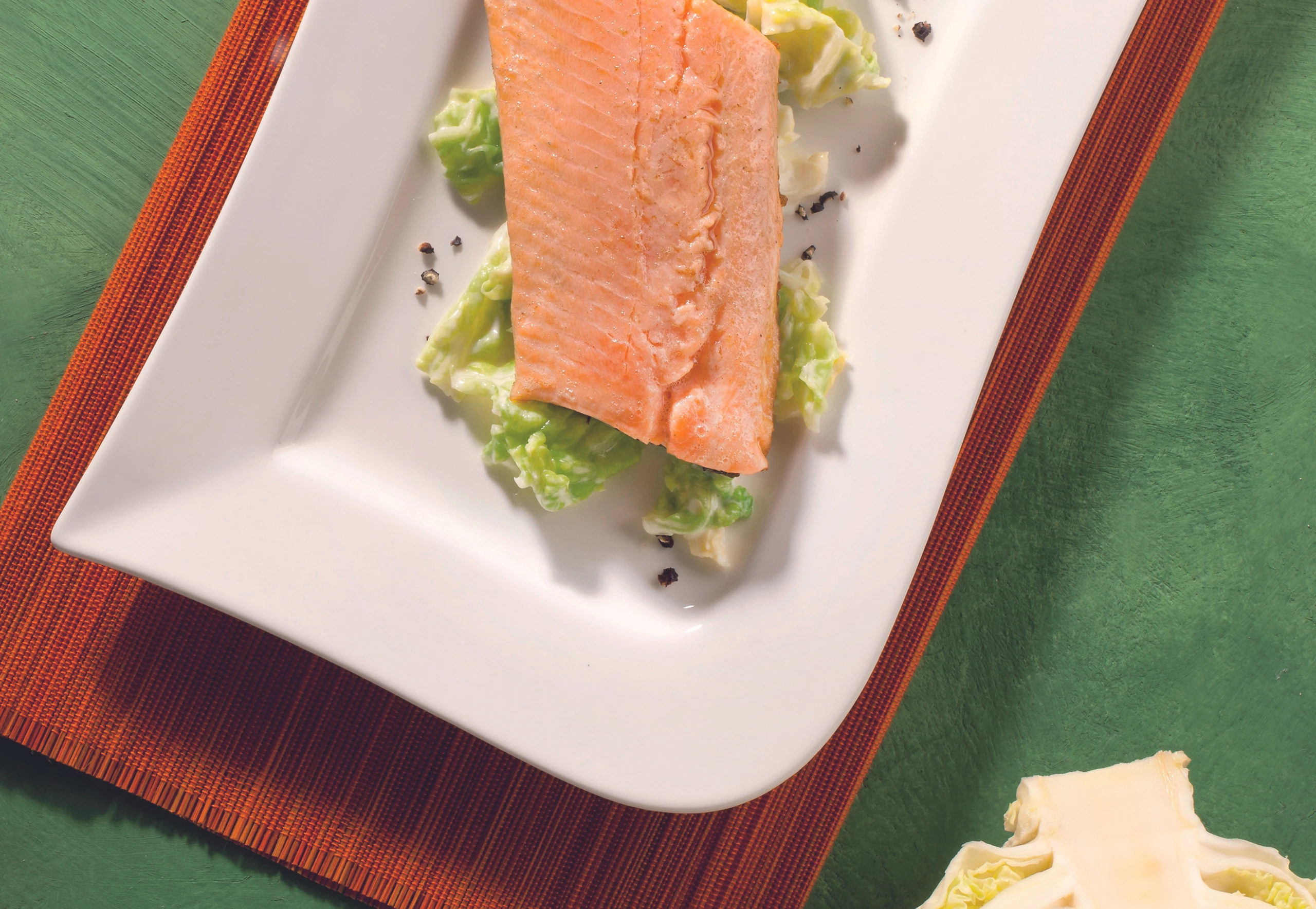 Forellenfilets in 4 gleich große Stücke schneiden, mit Salz und Pfeffer würzen. In einer beschichteten Pfanne Öl erhitzen, Fisch-stücke mit der Hautseite nach unten einlegen und bei schwacher Hitze langsam braten. Am Ende der Garzeit sollte die Haut knusprig und der Fisch glasig gebraten sein. Filets herausheben, auf Küchenpapier abtropfen lassen und mit dem Kohl anrichten.