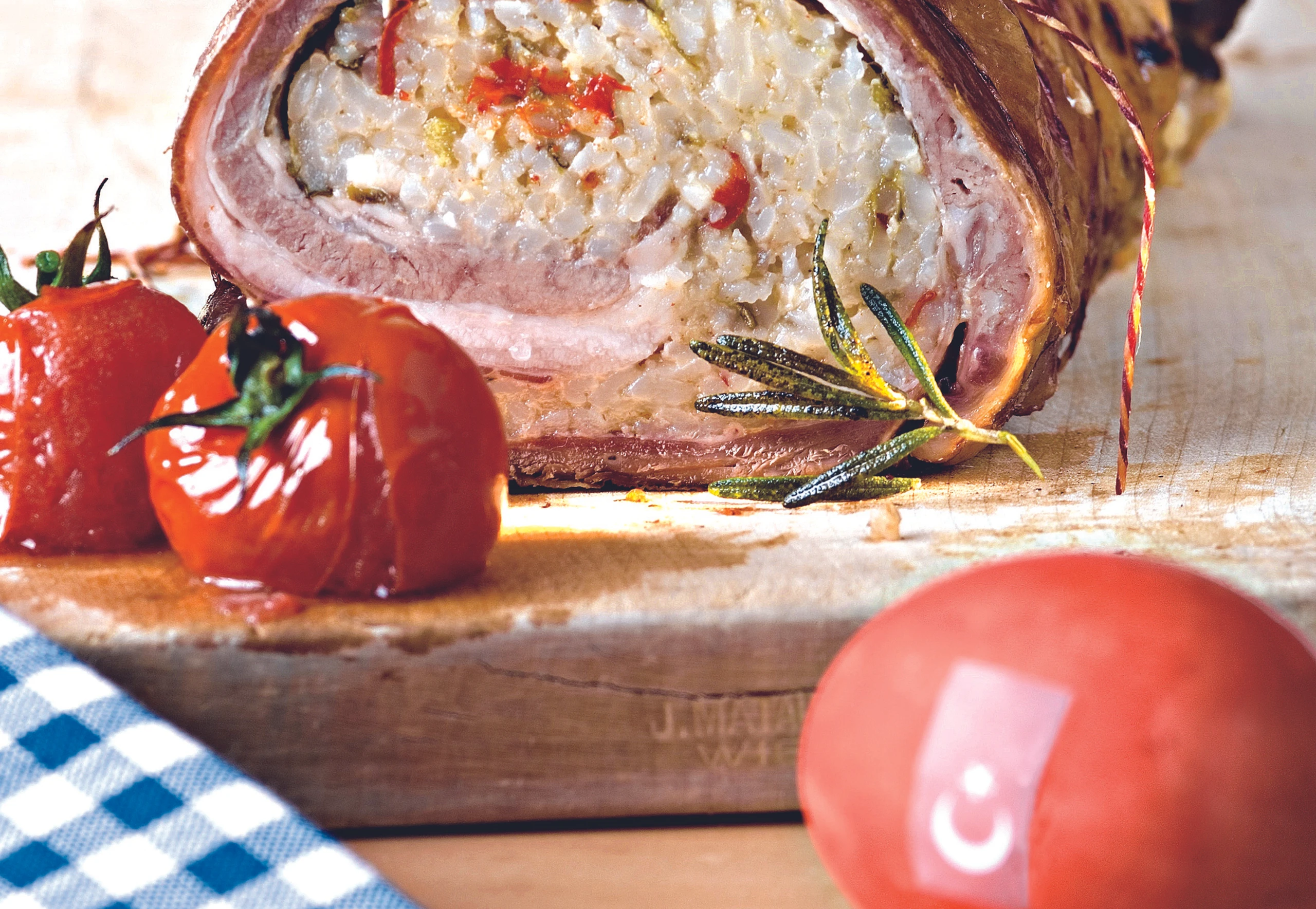 Fleisch mit der Reismasse bestreichen, einrollen, mit Spagat binden, mit Salz einreiben und mit Rosmarin belegen.