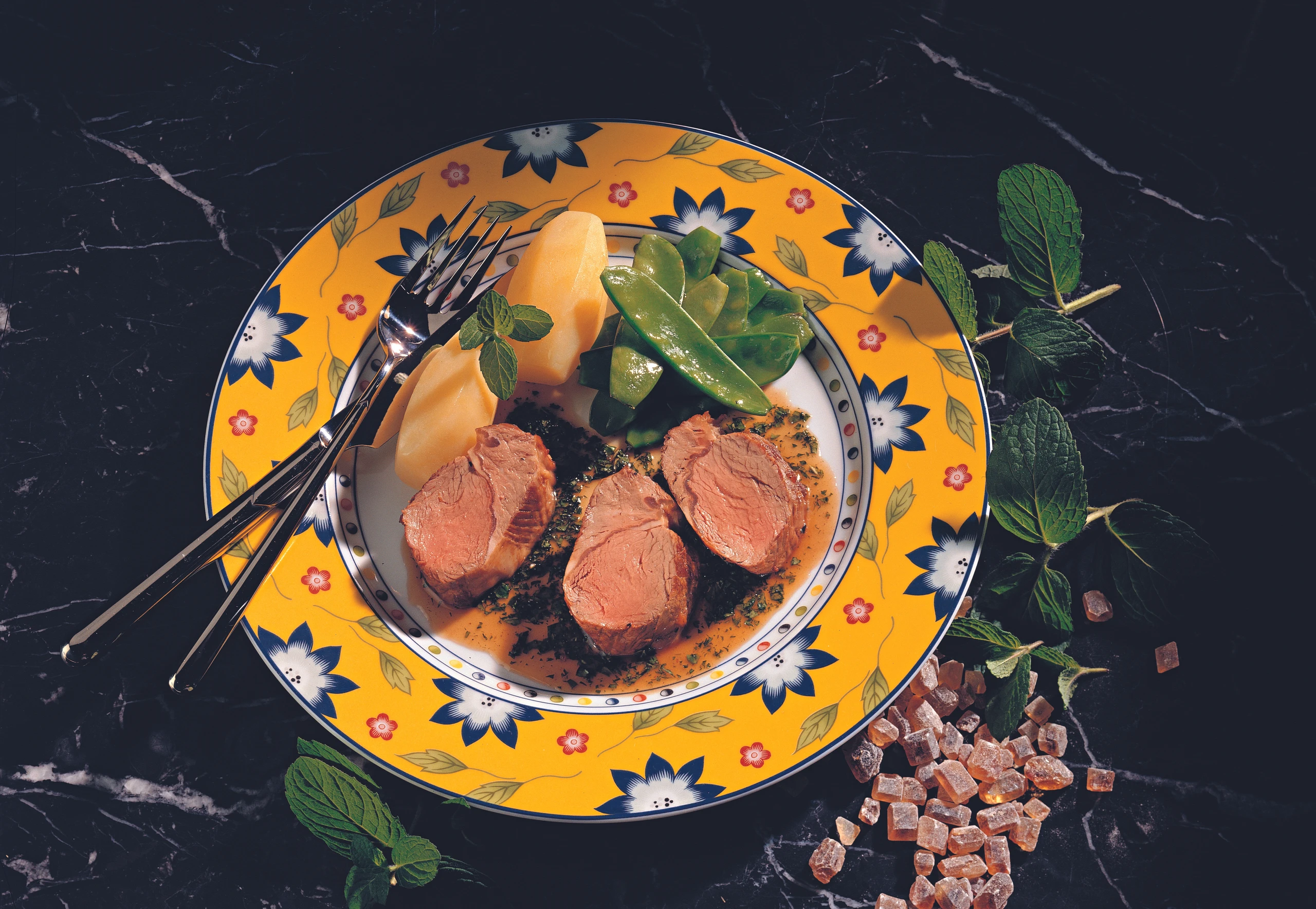 Lammfilets quer zur Faser in nicht zu dicke Scheiben schneiden und mit der Sauce anrichten. Als Beilagen passen Buttererdäpfel und bissfest gekochte Erbsenschoten.