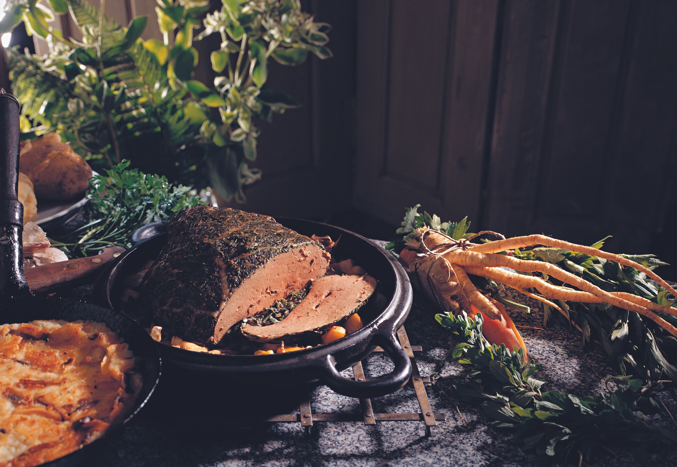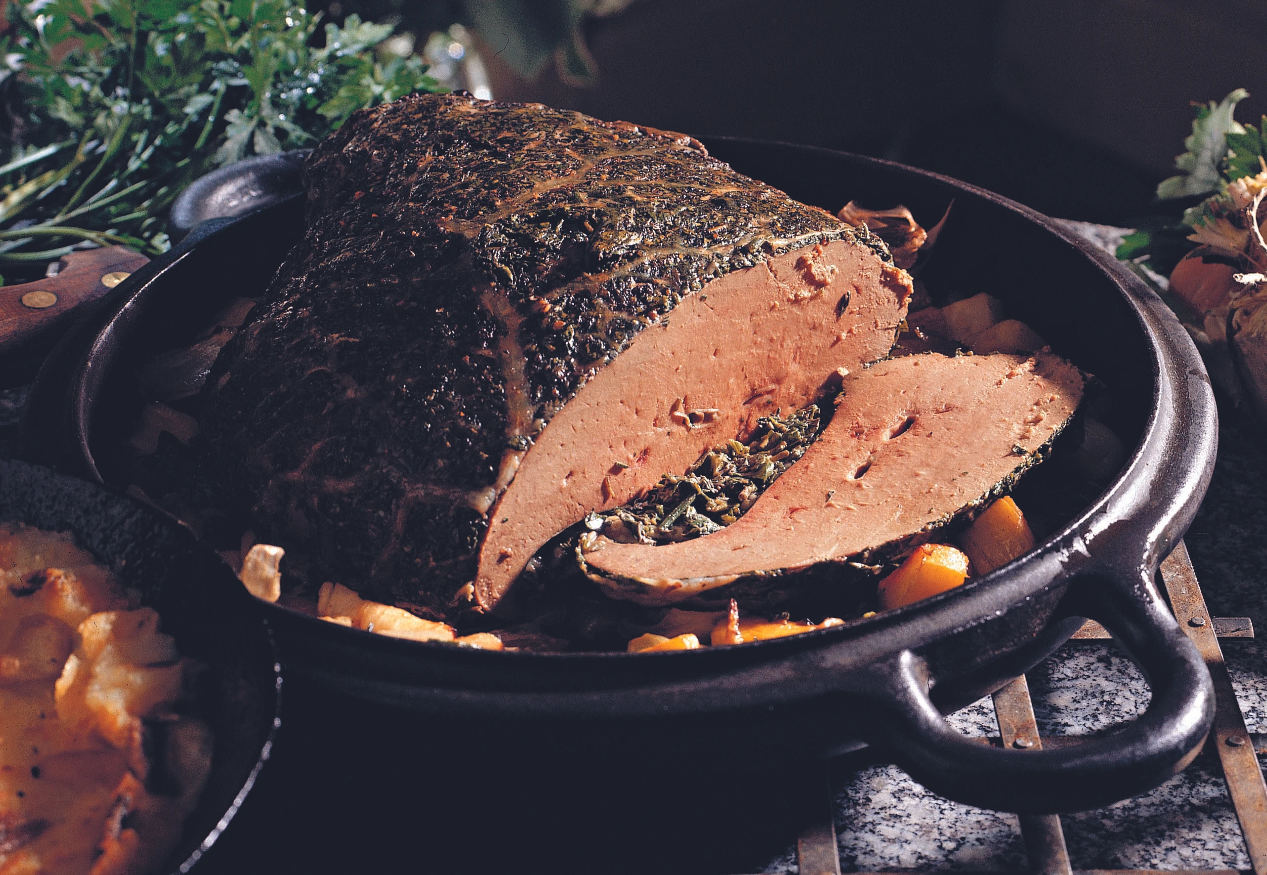Leber in wenig Öl beidseitig anbraten, aus der Pfanne heben. Wurzelwerk und Zwiebel im Bratensatz anschwitzen, Leber daraufsetzen, mit Suppe untergießen und im vorgeheizten Rohr ca. 40 Minuten braten.