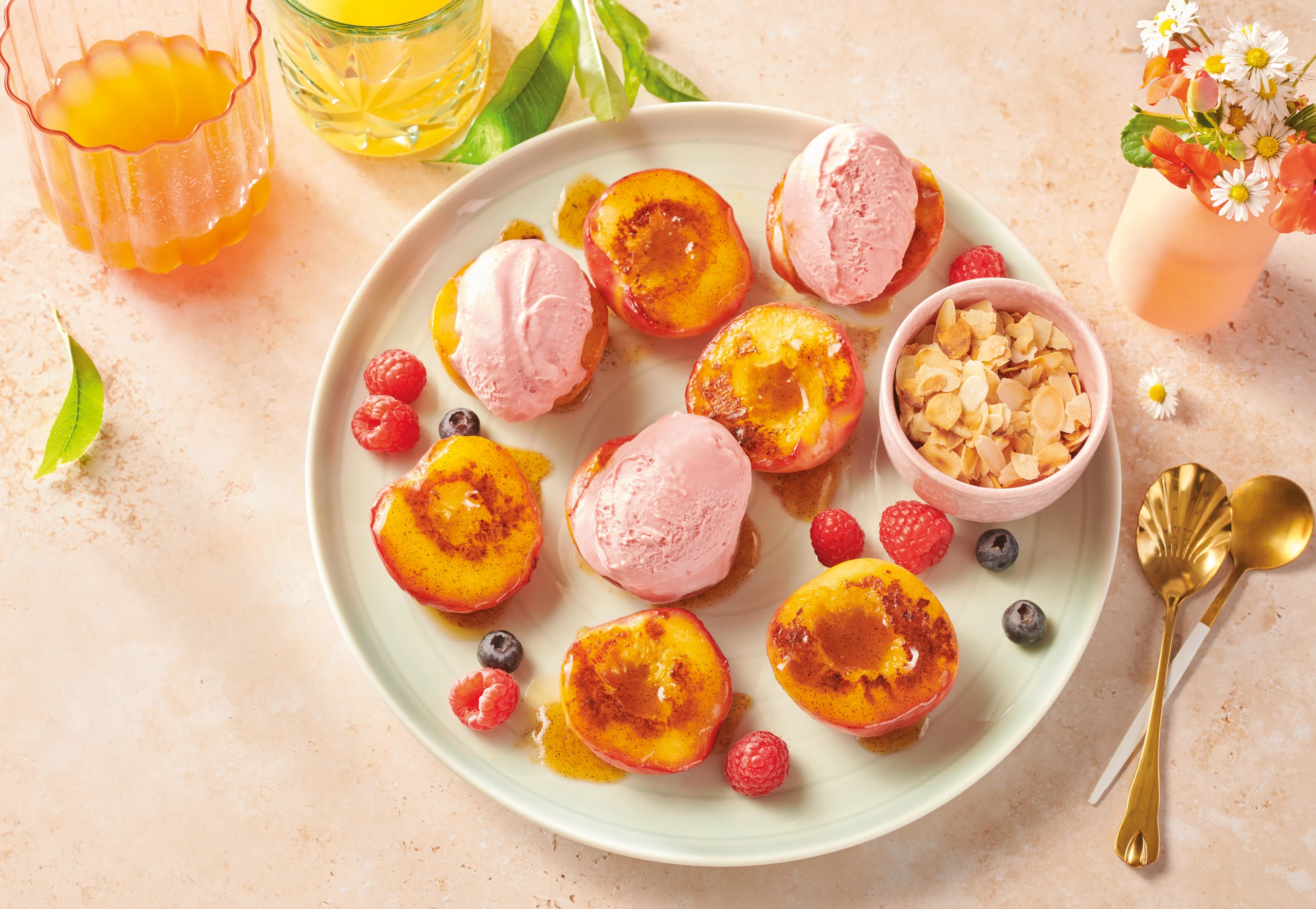 Gebratene Pfirsiche mit Vanillebutter und Erdbeer-Joghurt-Eis