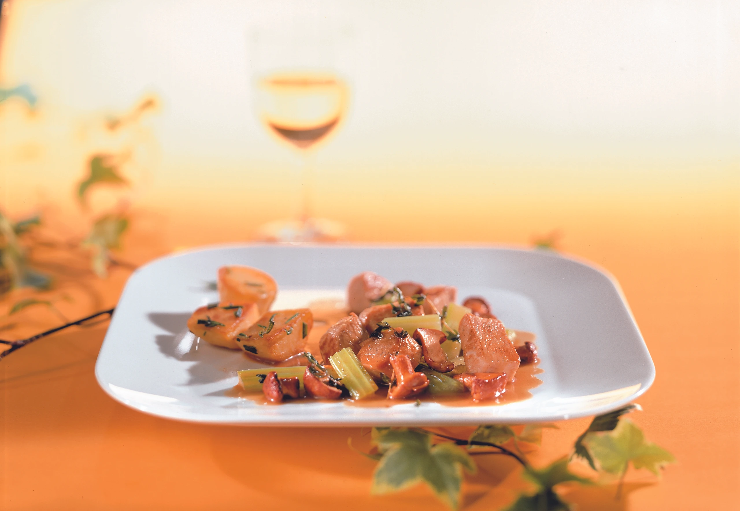 Gebratene Putenwürfel mit Eierschwammerln und Sellerie