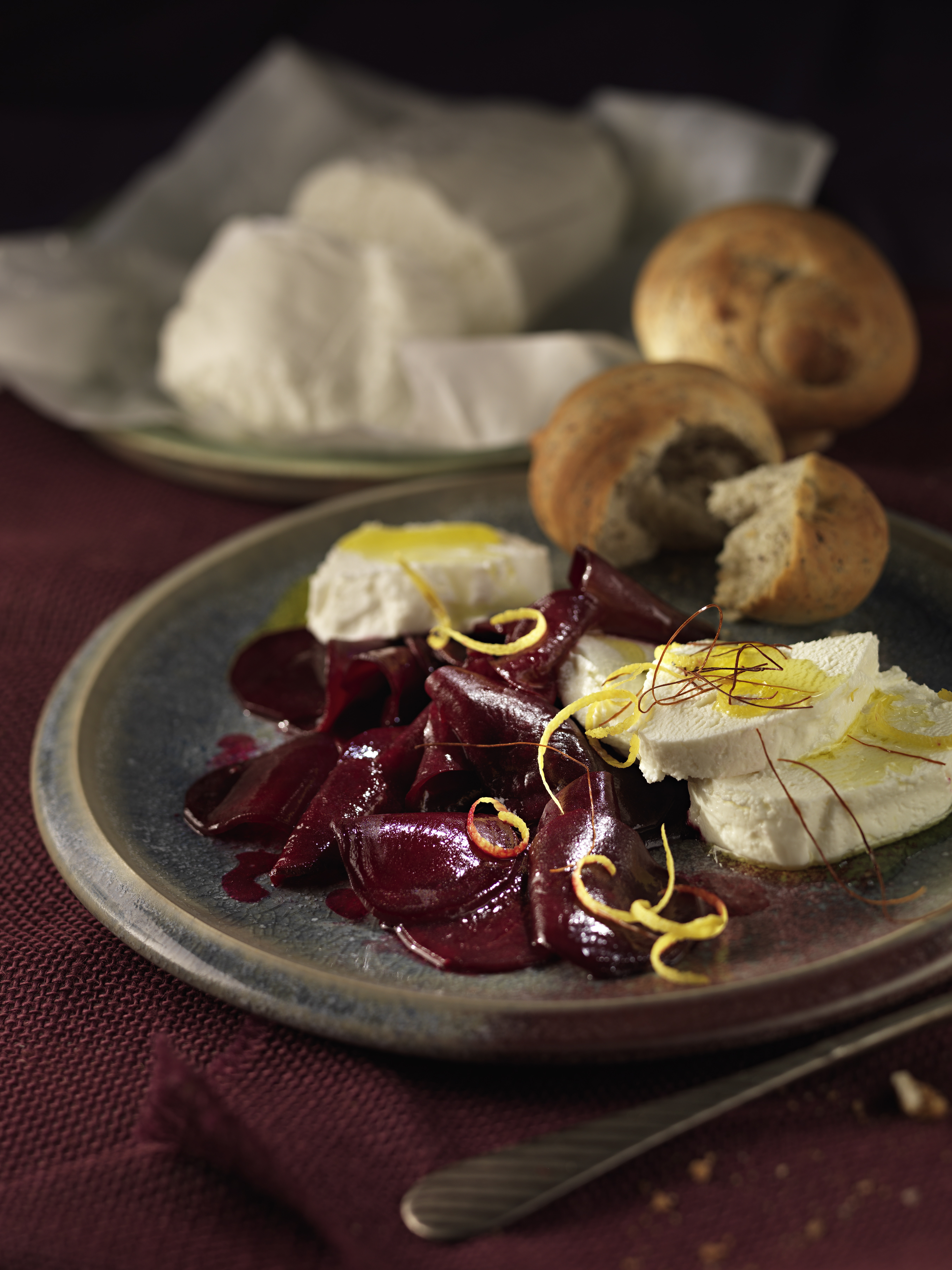 Ziegenkäse in Scheiben schneiden, Zitronenschale mit einem Zestenreißer abziehen. Käse mit den Roten Rüben anrichten, mit Zitronenzesten und Chilifäden bestreuen, mit Olivenöl beträufeln und mit dem Mohngebäck servieren.