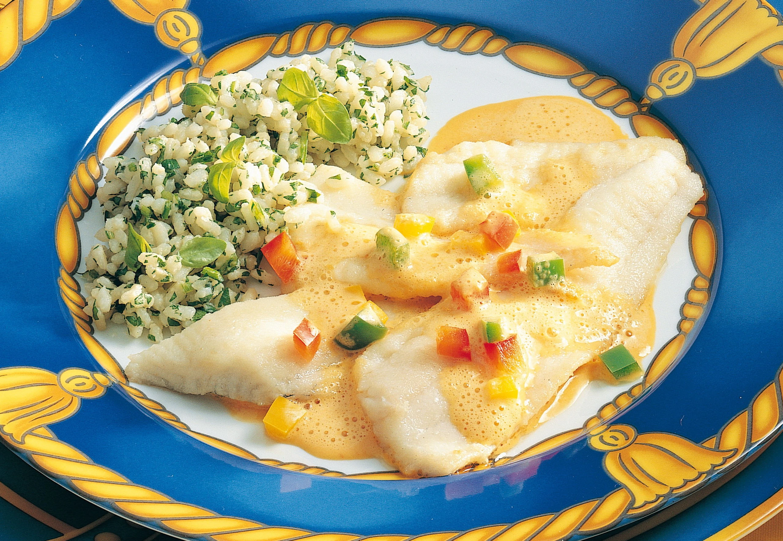 Gebratene Schollenfilets mit Paprikasauce und Kräuterreis