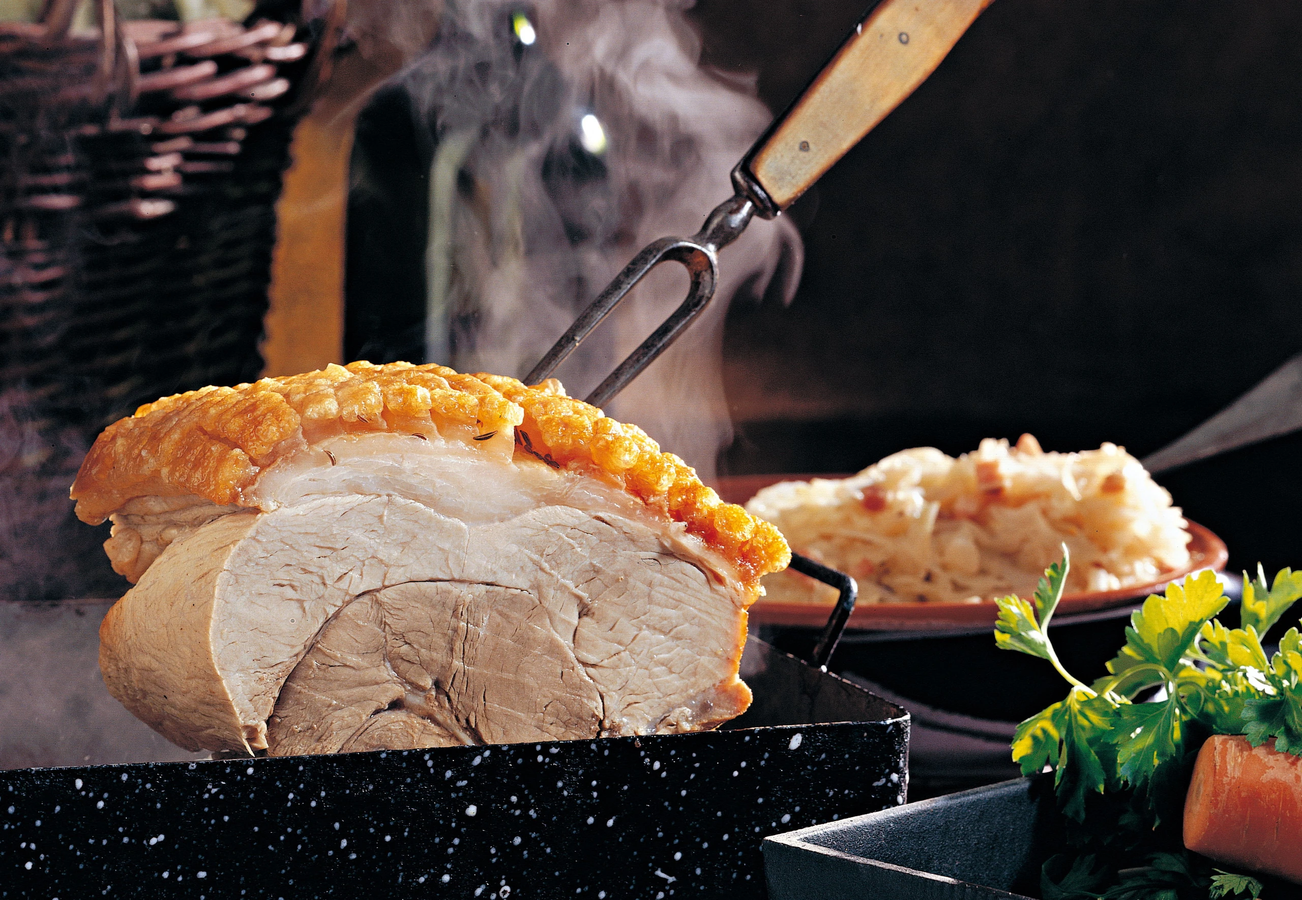 Fleisch mit Salz, Pfeffer, Majoran, Kümmel und zerdrücktem Knoblauch rundum einreiben. Schwarte in wenig Öl anbraten, Fleisch wenden, Zwiebel und Wurzelwerk zugeben und das Fleisch im vorgeheizten Rohr (mittlere Schiene / Gitterrost) ca. 11/4 Stunden braten. 4Nach ca. 1/4 Stunde der Bratzeit die Hälfte der Suppe zugießen. Während des Bratens immer wieder Suppe zugießen und den Braten mit entstehendem Bratensaft übergießen. 5Fleisch aus der Pfanne heben und warmstellen. Bratensaft durch ein Sieb gießen, aufkochen und durch Einrühren von 1 EL Butter binden (Sauce nicht mehr kochen). 6Fleisch in Scheiben schneiden und mit dem Bratensaft und den Beilagen anrichten.
