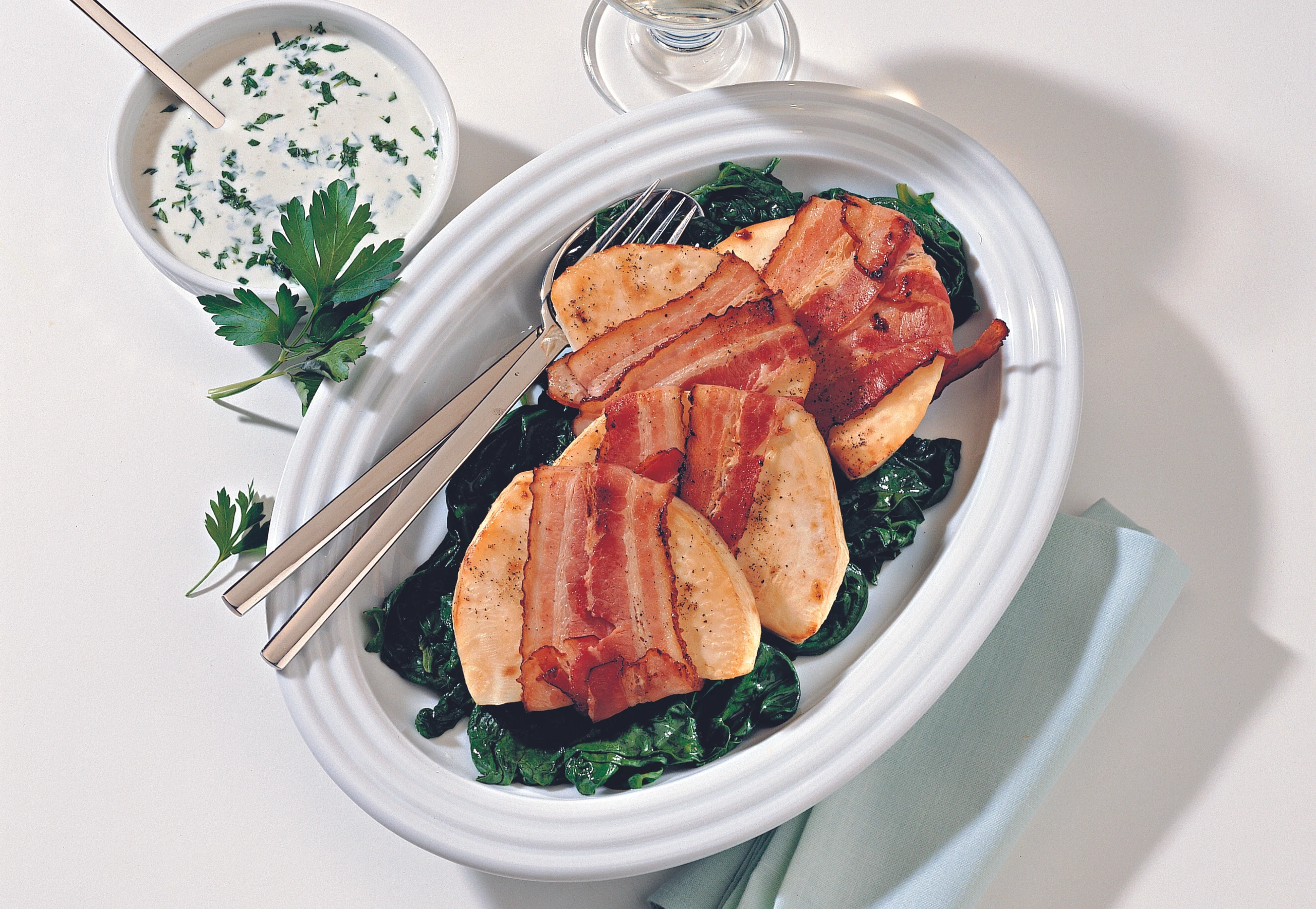 Je zwei Speckscheiben um jede Selleriescheibe wikkeln, mit Zahnstochern gut fixieren und mit Salz und Pfeffer würzen.