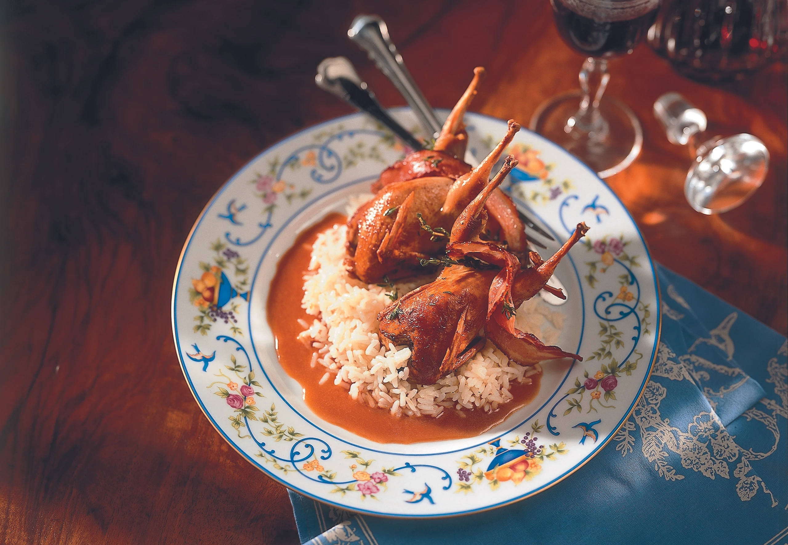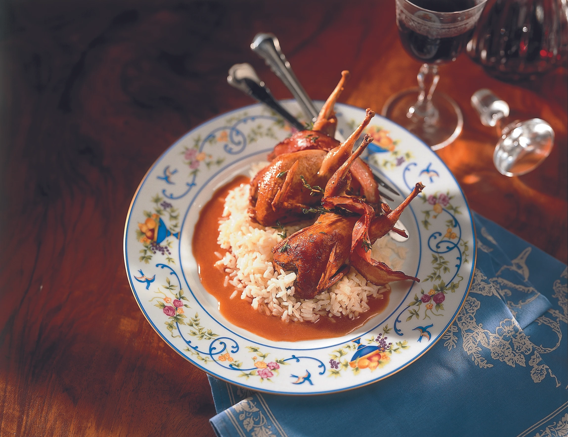 Wachteln und Speckscheiben auf Reis anrichten, mit der Sauce umgießen.