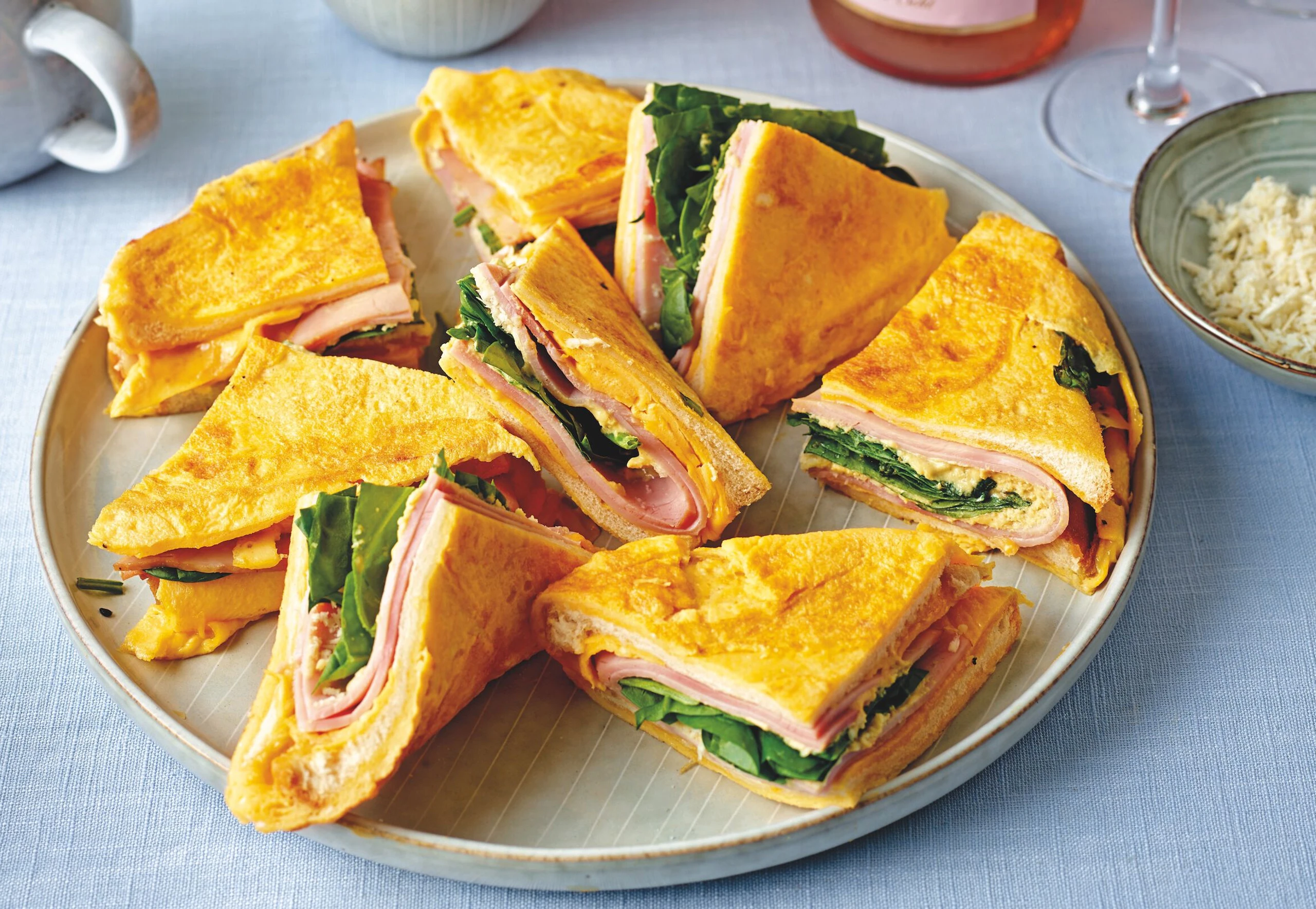 Gebratener Eiertoast mit Beinschinken, Kren und Babyspinat