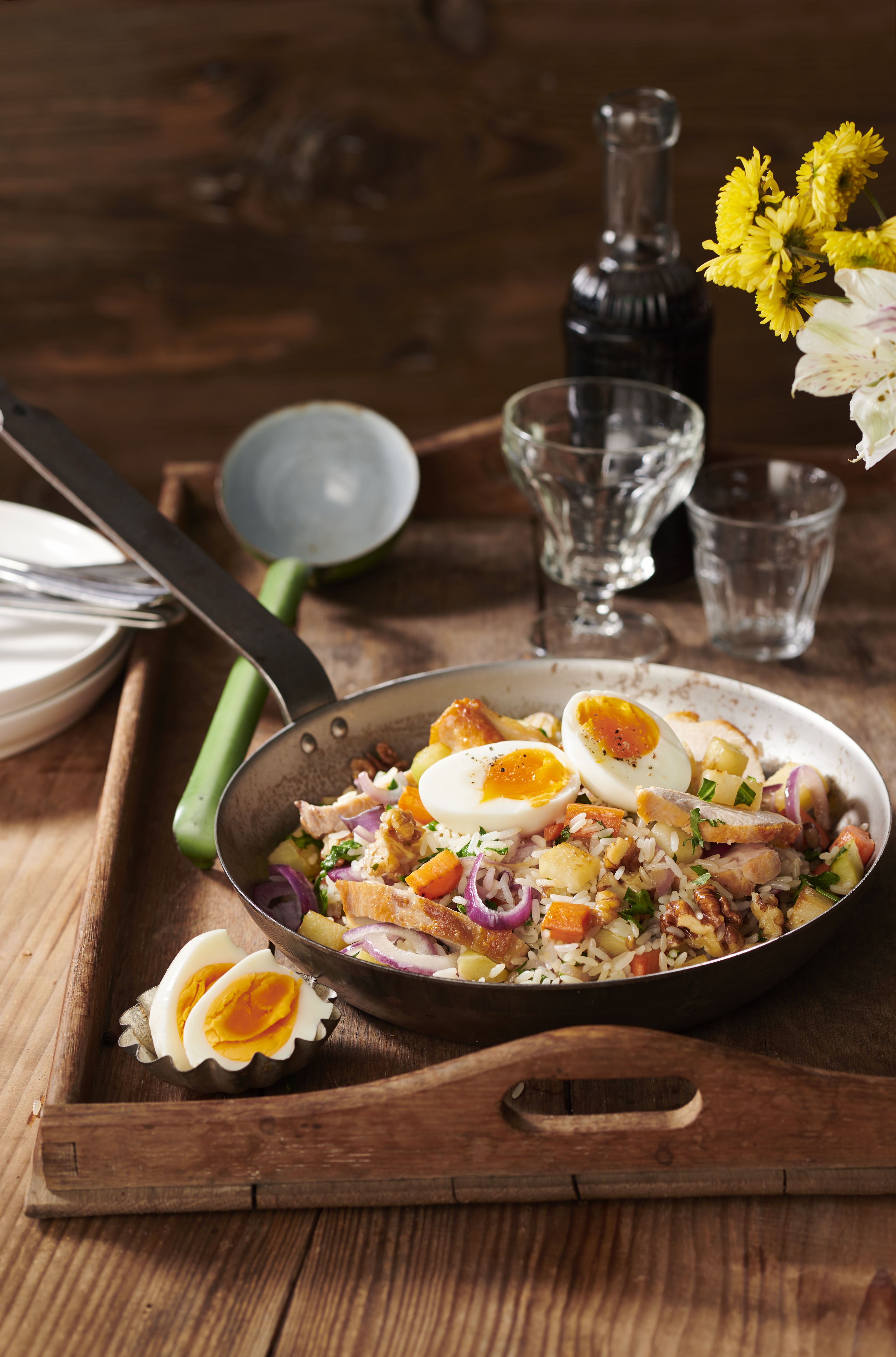 Eier in Salzwasser ca. 8 Minuten köcheln, abschrecken, schälen, längs halbieren und pfeffern. Filets quer in Scheiben schneiden, mit dem Reis anrichten und mit den Eiern garniert servieren.