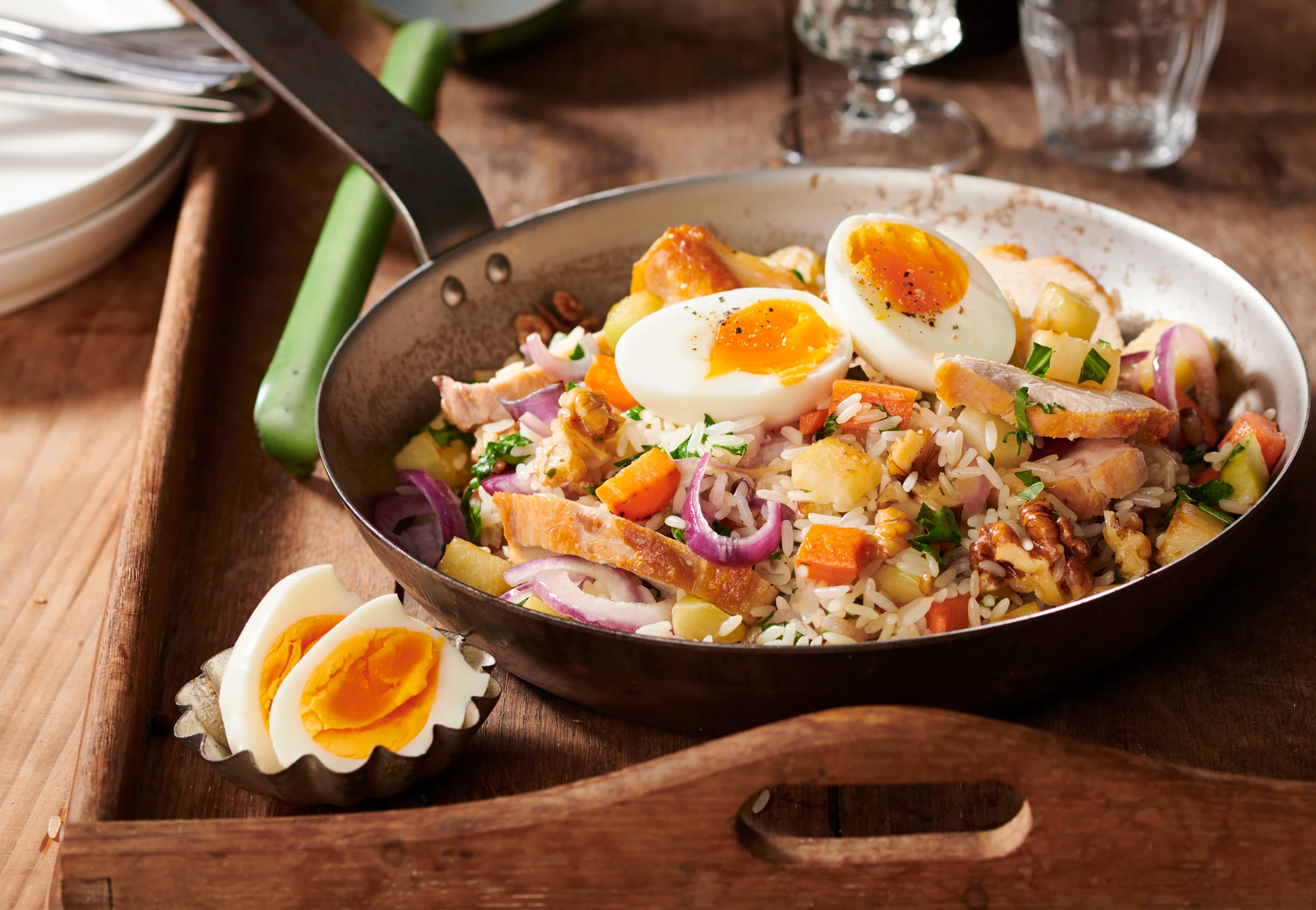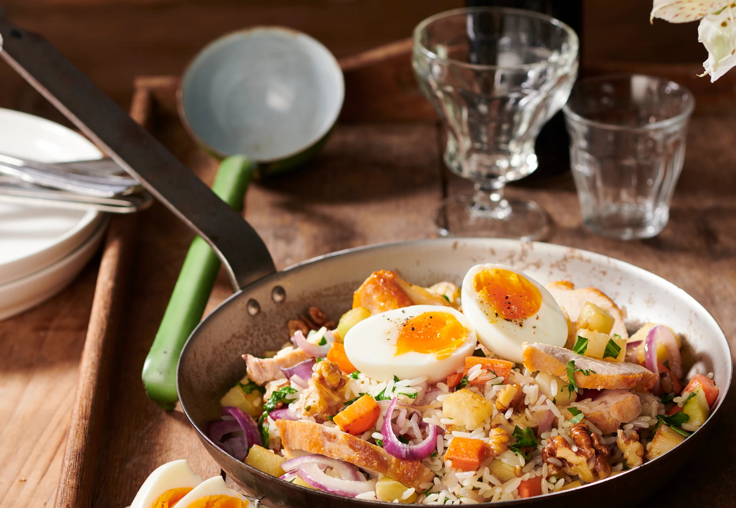 Im Bratrückstand Gemüse anbraten, mit Suppe ablöschen und bissfest dünsten. In einer zweiten Pfanne Nussöl erhitzen, Reis zugeben und unter Rühren braten. Reis, Gemüse, Nüsse und Rucola vermischen und mit Salz und Pfeffer würzen.