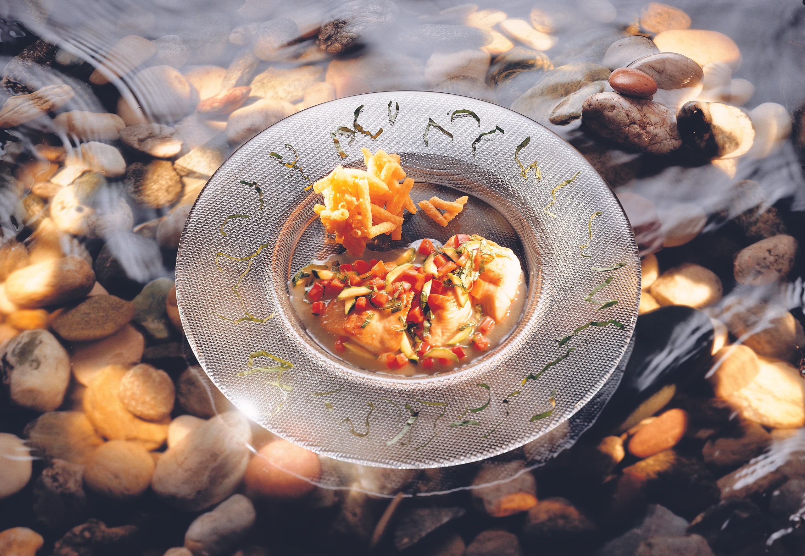 Im Bratrückstand 1 TL Butter erhitzen, Paprika, Zucchini und zerdrückten Knoblauch darin anschwitzen, mit Suppe aufgießen und aufkochen. Stärkemehl mit einigen Tropfen Wasser glattrühren, in die Sauce mischen und aufkochen – restliches Basilikum untermischen. Fischfilets mit der Sauce anrichten.
