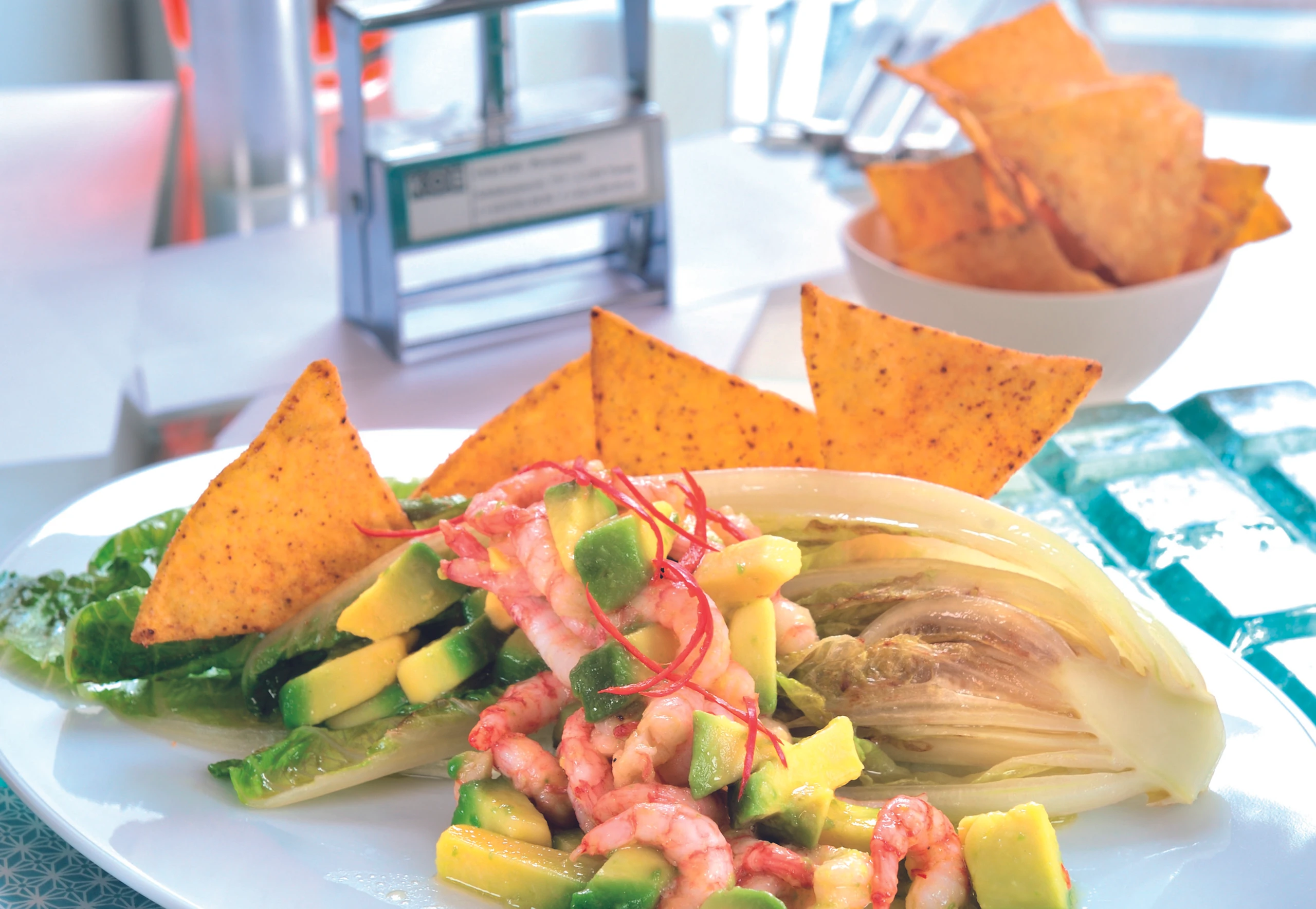 Kochsalat putzen und der Länge nach halbieren. In einer Pfanne übriges Öl erhitzen, Salathälften mit den Schnittflächen nach unten einlegen, anbraten und anrichten. Avocados und Shrimps auf den Salathälften verteilen, mit Chilis bestreuen und mit den Tortilla-Chips servieren.