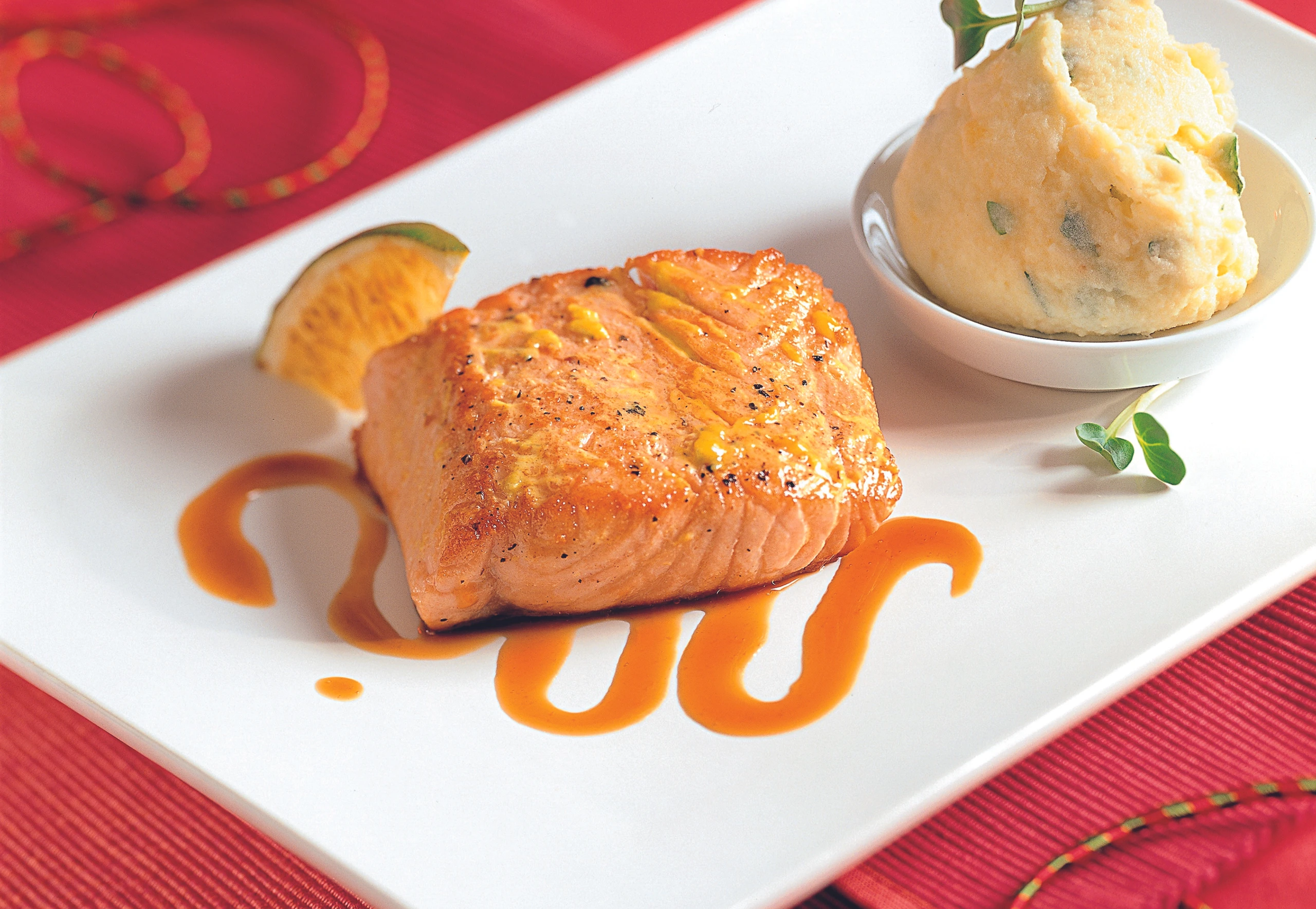 Bratrückstand mit Limettensaft, Sojasauce und Suppe ablöschen und aufkochen. Stärke mit Wasser glatt rühren, in die Sauce rühren und kurz erhitzen. Lachs mit Sauce und Erdäpfelpüree anrichten.