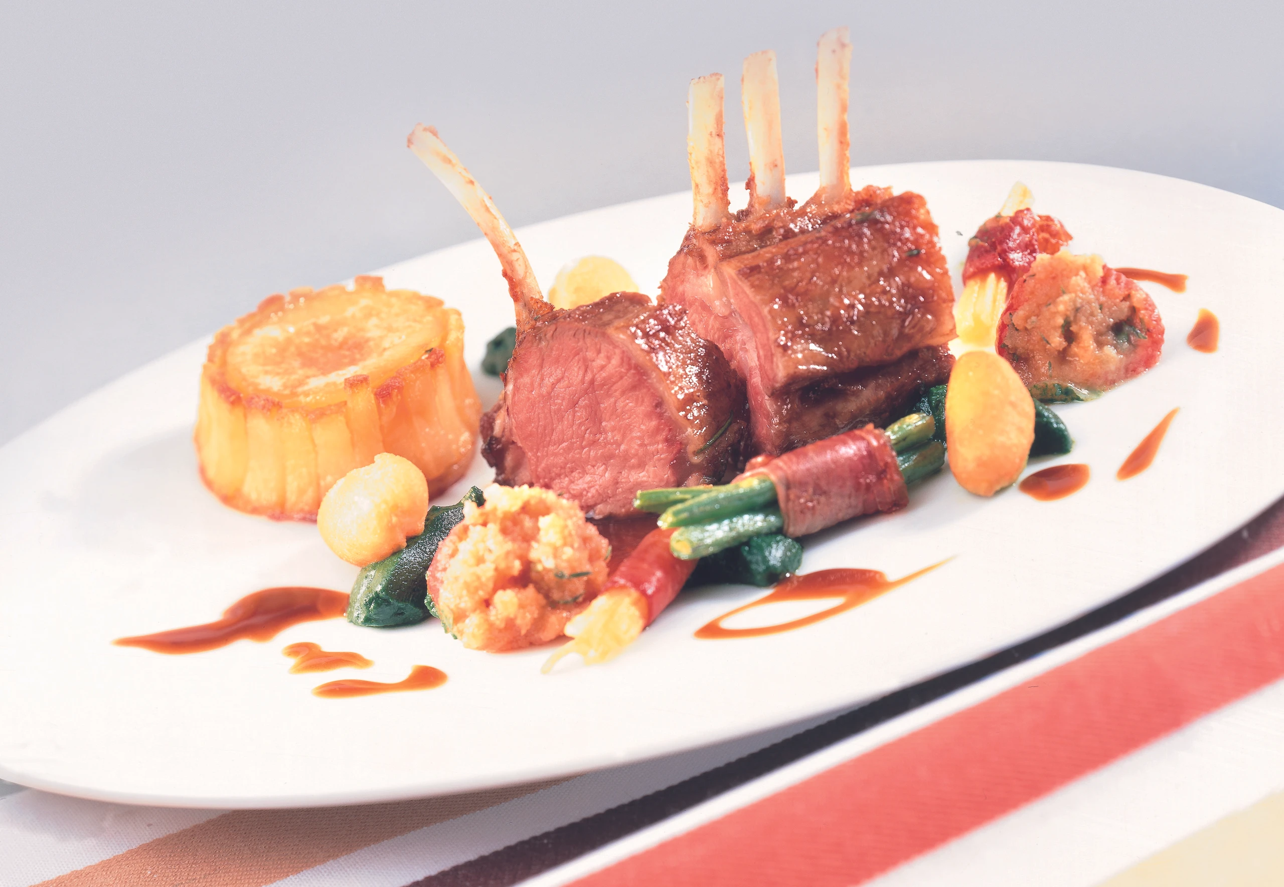 Fleisch aus der Pfanne heben und zugedeckt warm stellen. Bratrückstand mit Bratensaft aufgießen und ca. 1 Minute kochen. Saft durch ein Sieb gießen, aufkochen und durch Einrühren der Butter binden. Lammfilets in Scheiben schneiden und mit der Sauce und den Beilagen anrichten.