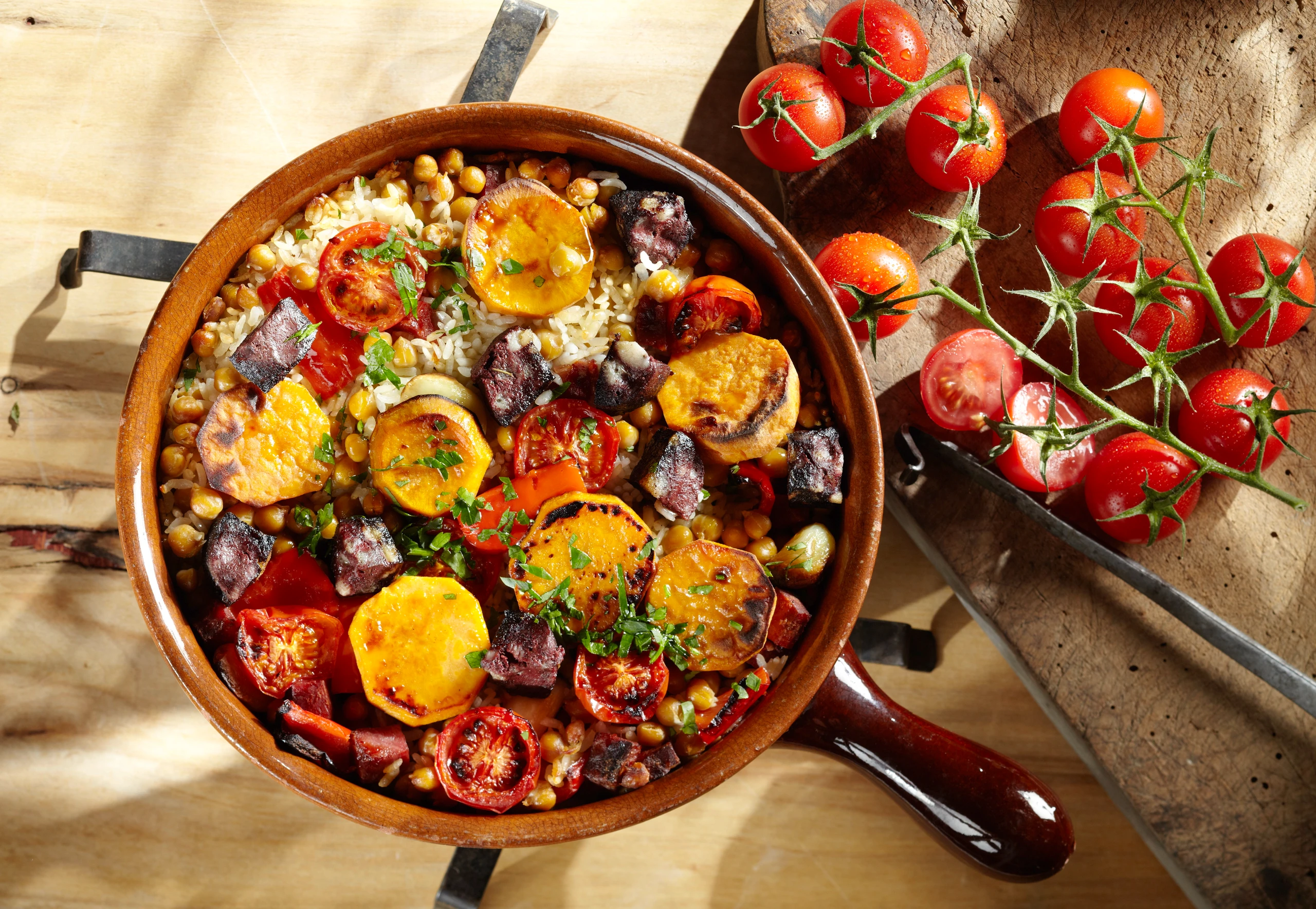 Rohr auf 200°C vorheizen. Zwiebel und Chorizo in 2 EL Öl anschwitzen. Reis zugeben und anschwitzen. Paprika zugeben und mitbraten, mit Sherry ablöschen. Süßkartoffeln zugeben und mit Suppe aufgießen, salzen und pfeffern. Kichererbsen untermengen, salzen und pfeffern. Reismischung in einer Tonform verteilen. Blutwurst und Paradeiser darauf verteilen, mit wenig Öl beträufeln. Reis zudecken und im Rohr (untere Schiene / Gitterrost) ca. 40 Minuten garen; nach halber Garzeit Deckel entfernen.