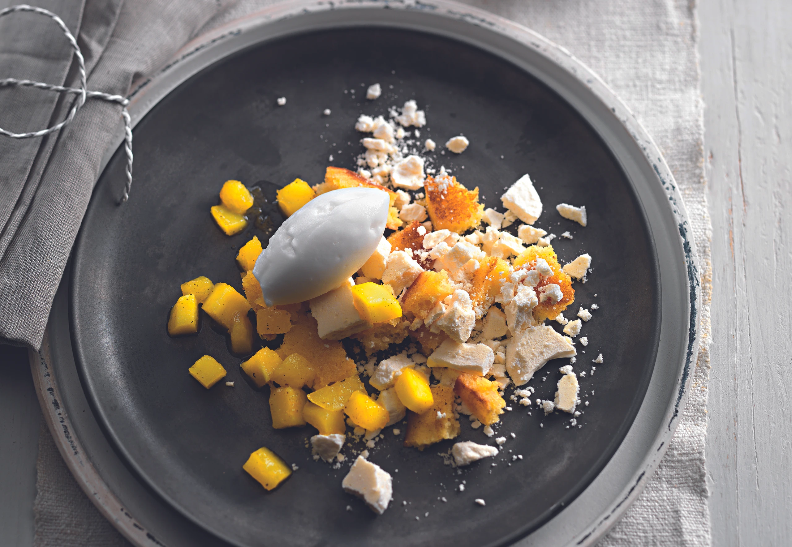Kuchenstücke in aufgeschäumter Butter beidseitig braten, in Stücke teilen, mit Sorbet, Mango- und Baiserstücken anrichten.