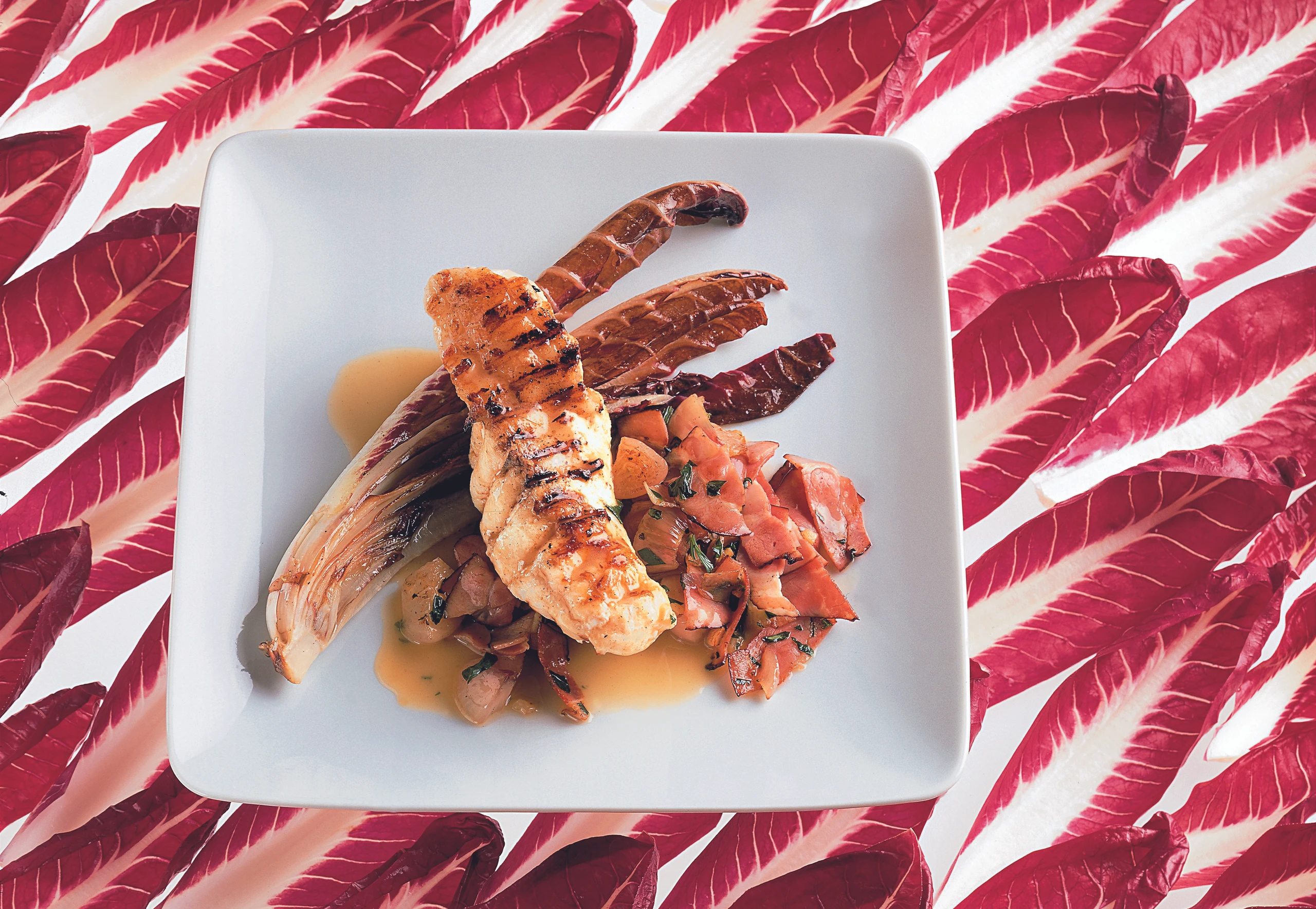 Die Hälfte vom Olivenöl erhitzen, Speck und Schalotten unter Rühren ca. 3 Minuten anbraten, Knoblauch einrühren. Radicchio darin beidseitig ca. 2 Minuten braten, salzen, pfeffern und mit Essig und übrigem Olivenöl beträufeln. Petersilie einrühren.