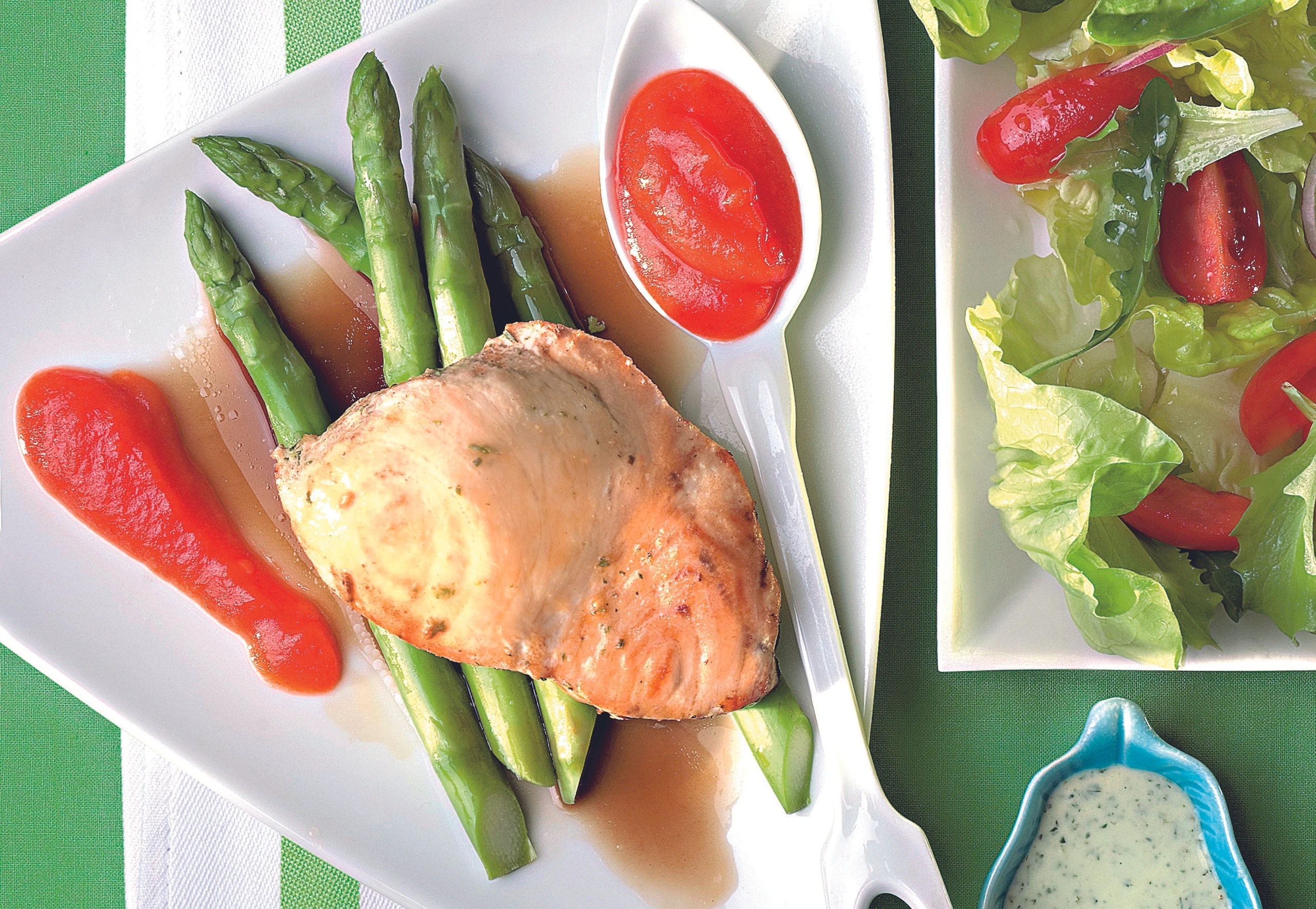 Gebratenes Fischfilet mit Spargel und Paprika-Dip