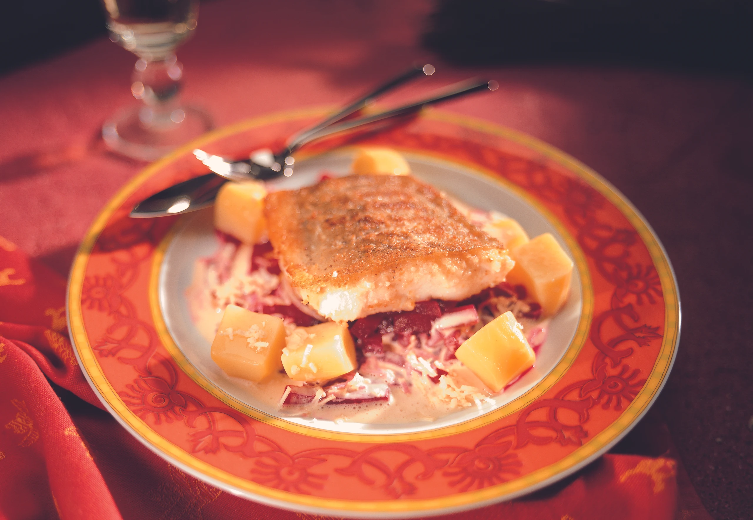 Gebratenes Kabeljaufilet mit Roten Rüben und Krensauce
