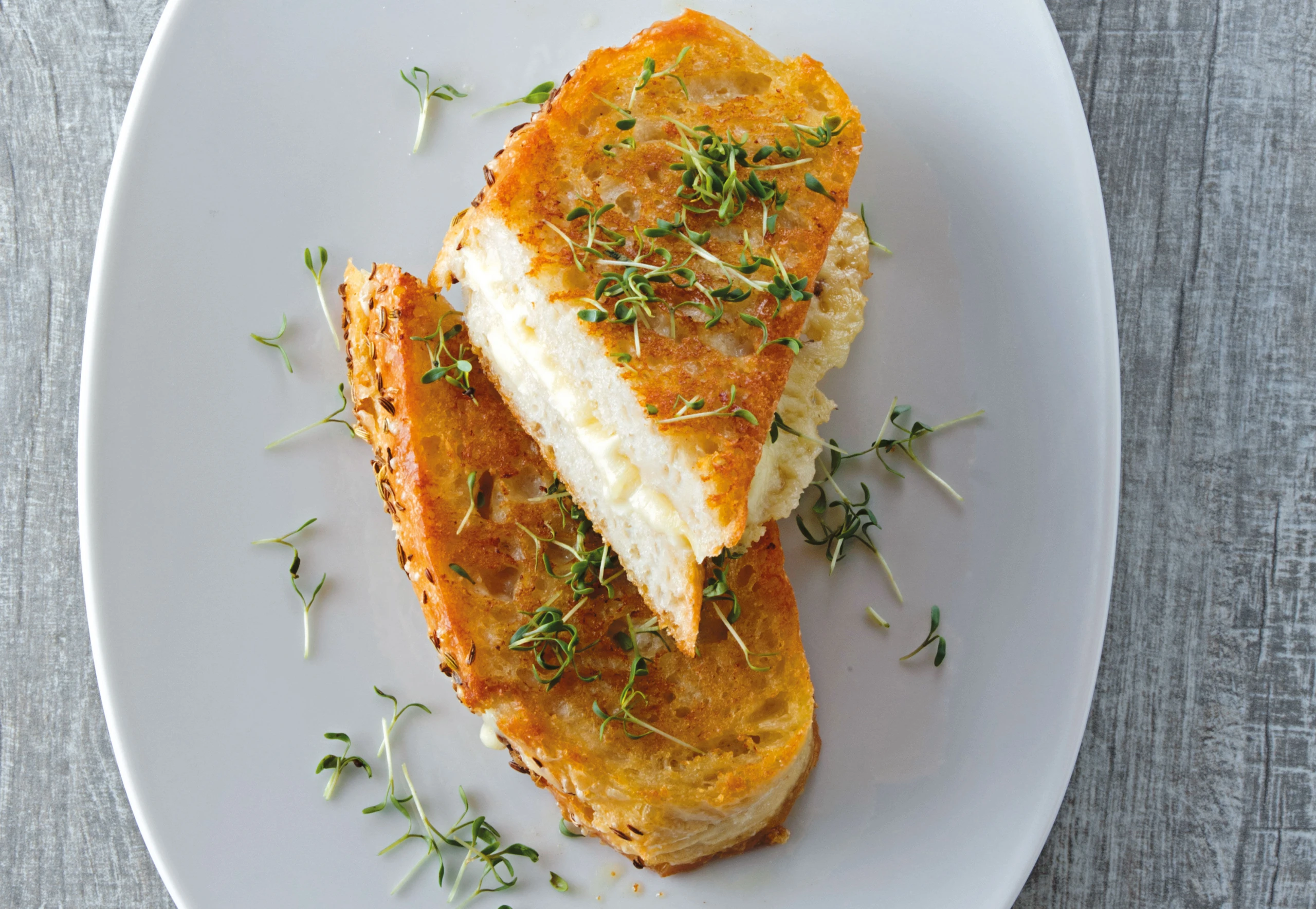 Sandwiches in eine trockene Pfanne legen, abdecken und bei mittlerer Hitze ca. 4 Minuten braun braten. Sandwiches wenden und weitere 4 Minuten braten. Herausnehmen und mit Kresse bestreuen.