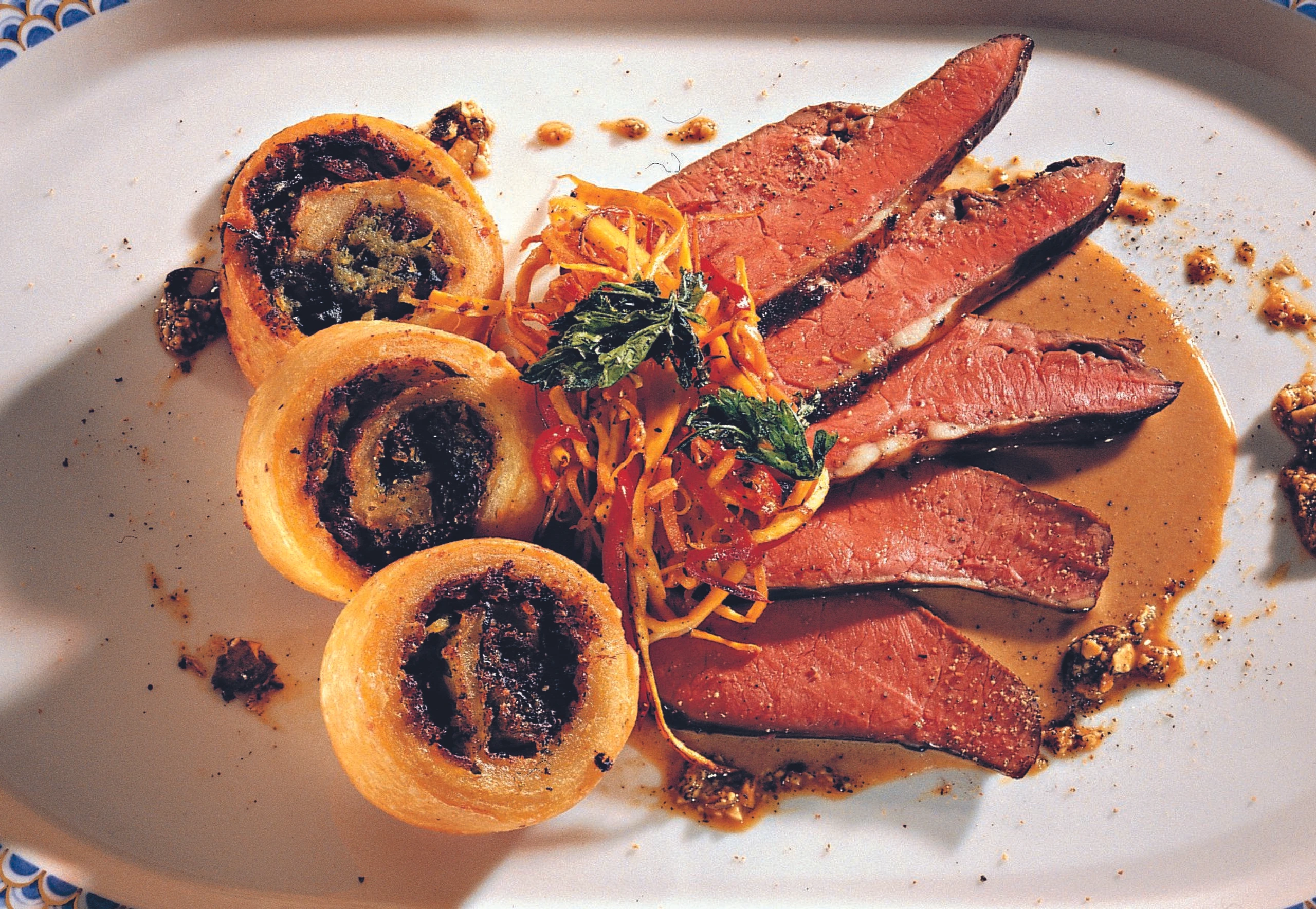 Herzen in Scheiben schneiden und mit der Sauce, den Gemüsestreifen und den Krautkrapferln (siehe Rezept) anrichten.