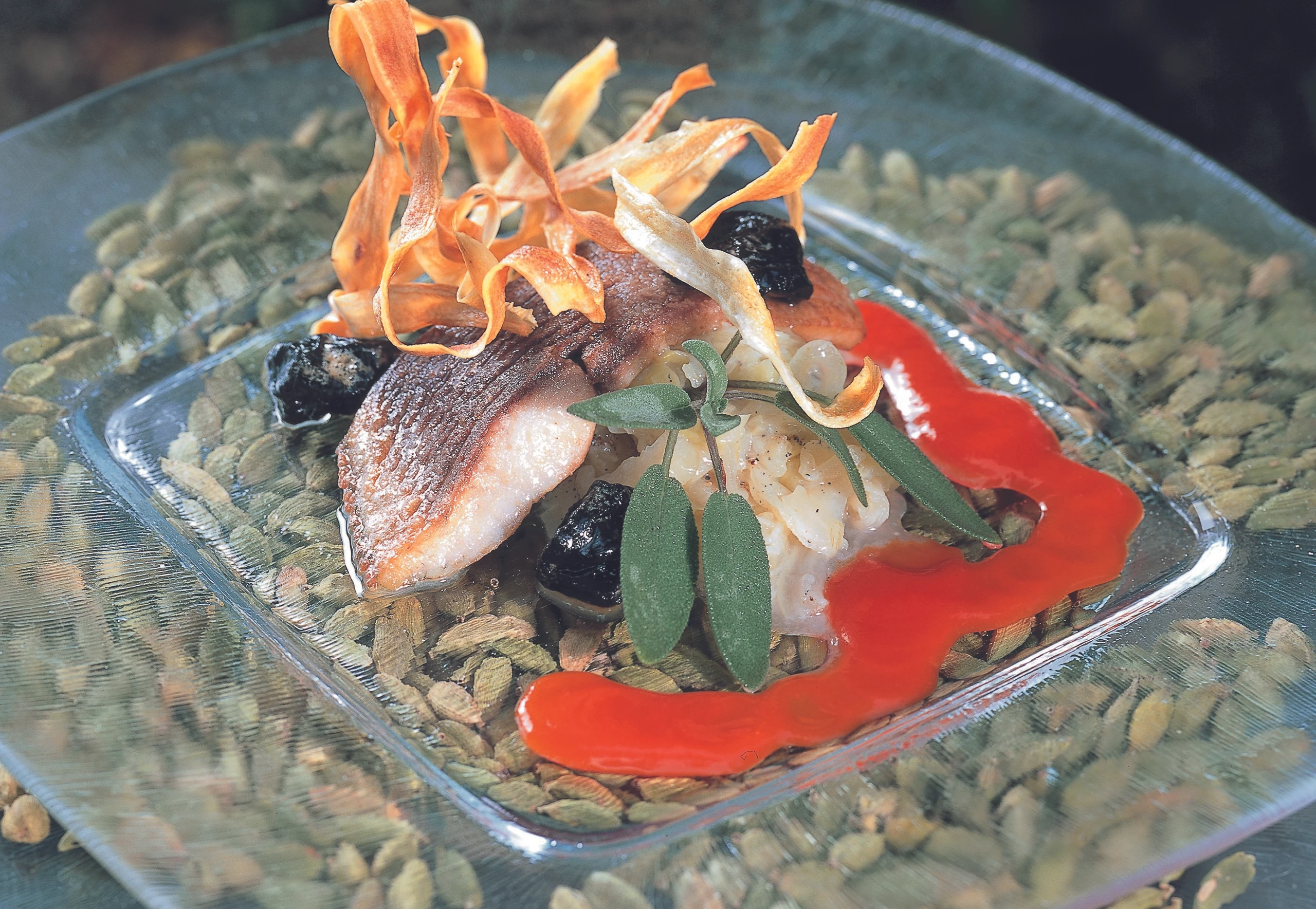 Sauce aufkochen, durch Einrühren der Butterstücke binden, dann nicht mehr kochen lassen. Karpfenfilets mit Zwetschken, Paprikasauce und Kardamomkraut (siehe Rezept) anrichten, mit Salbeiblättern garnieren.