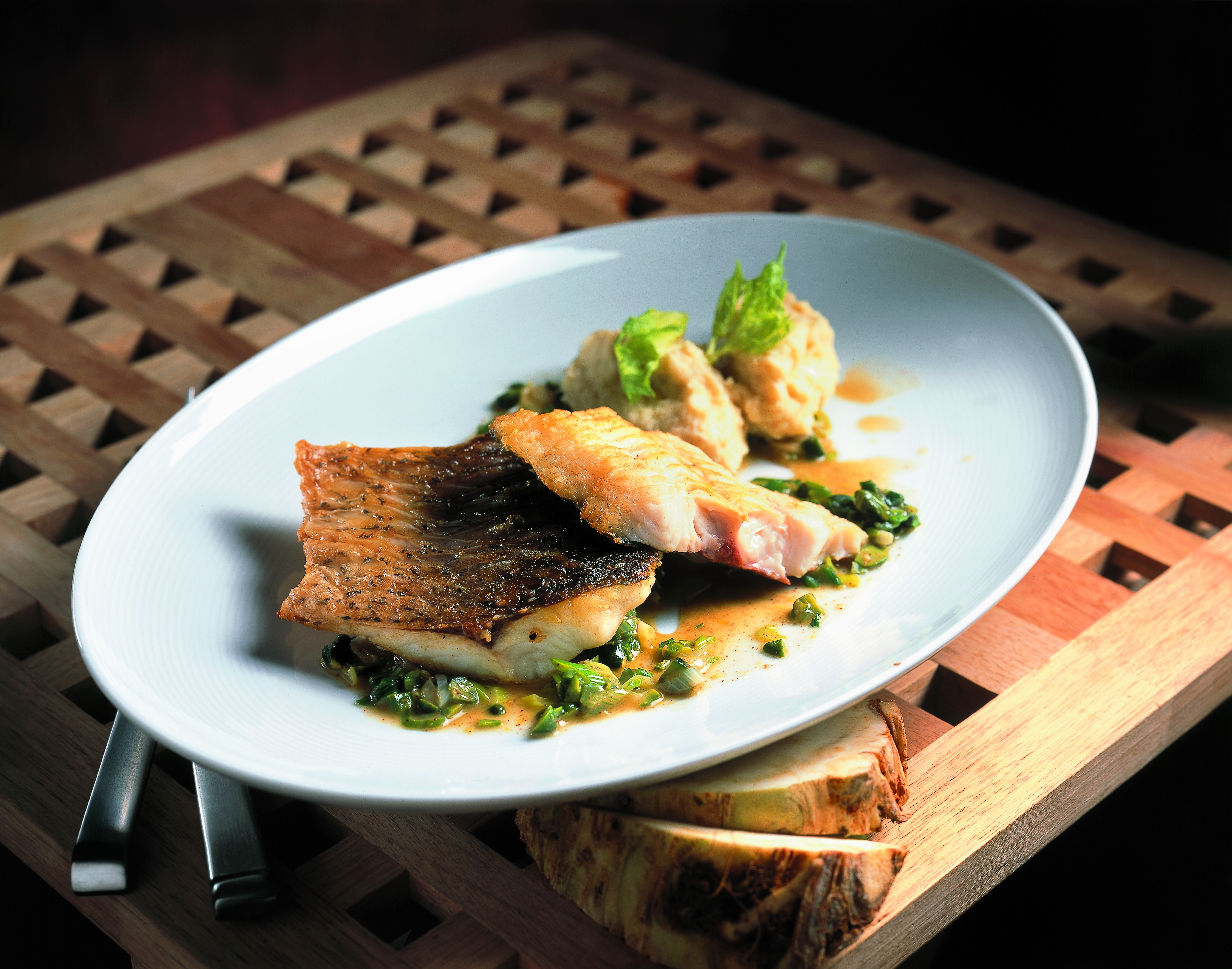 Gebratenes Karpfenfilet mit Pistaziensauce und Selleriepüree