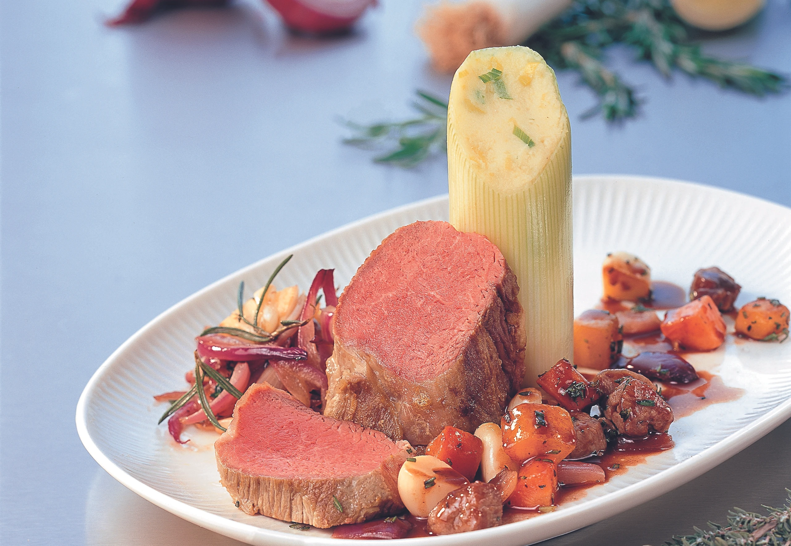 Lammfilets in Scheiben schneiden und mit Ragout und Lauch-Cannelloni anrichten.