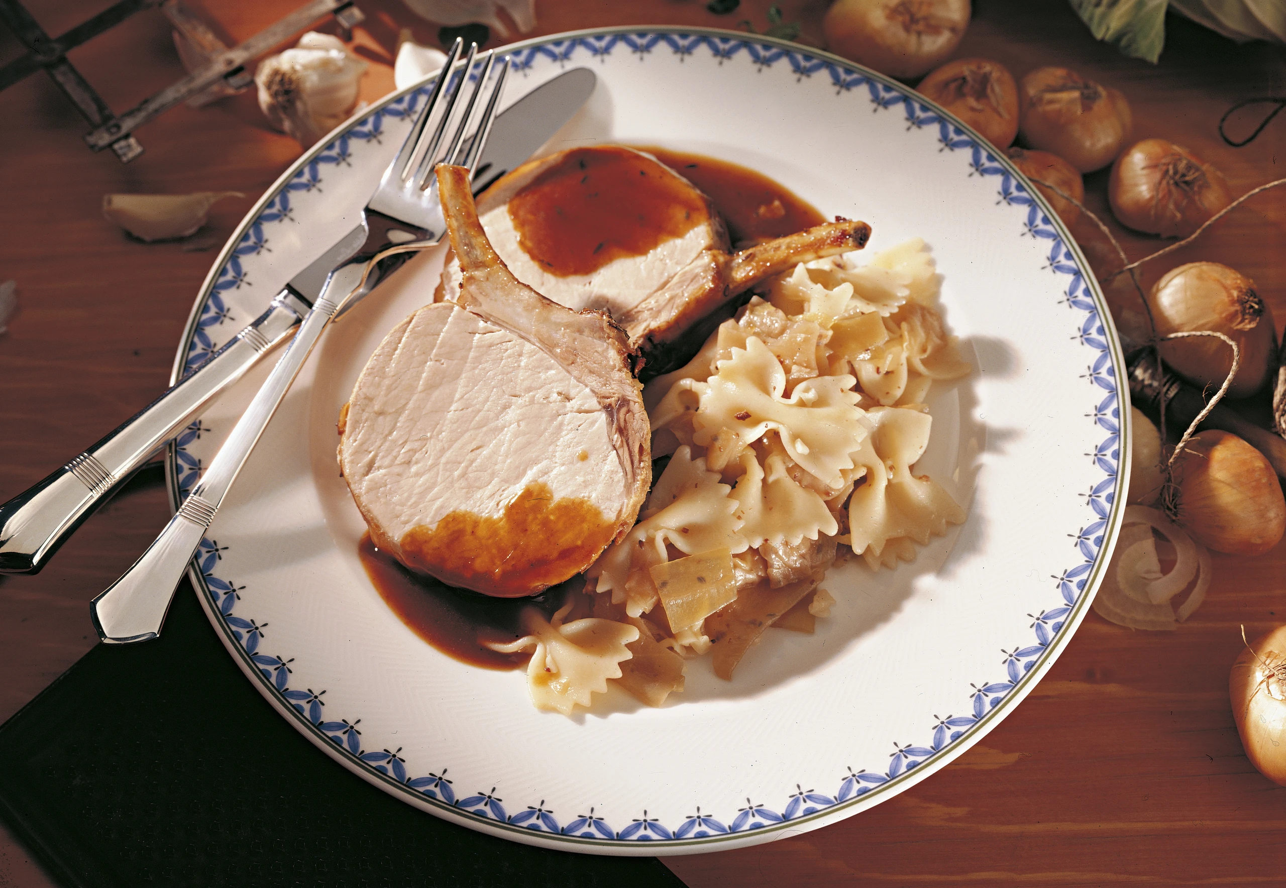 Schweinskarree aus der Pfanne heben und vor dem Anschneiden ca. 1/4 Stunde rasten lassen. Inzwischen Bratrückstand mit wenig Suppe aufgießen, aufkochen und abseihen. Das Fleisch in Scheiben schneiden und mit Bratensaft anrichten.