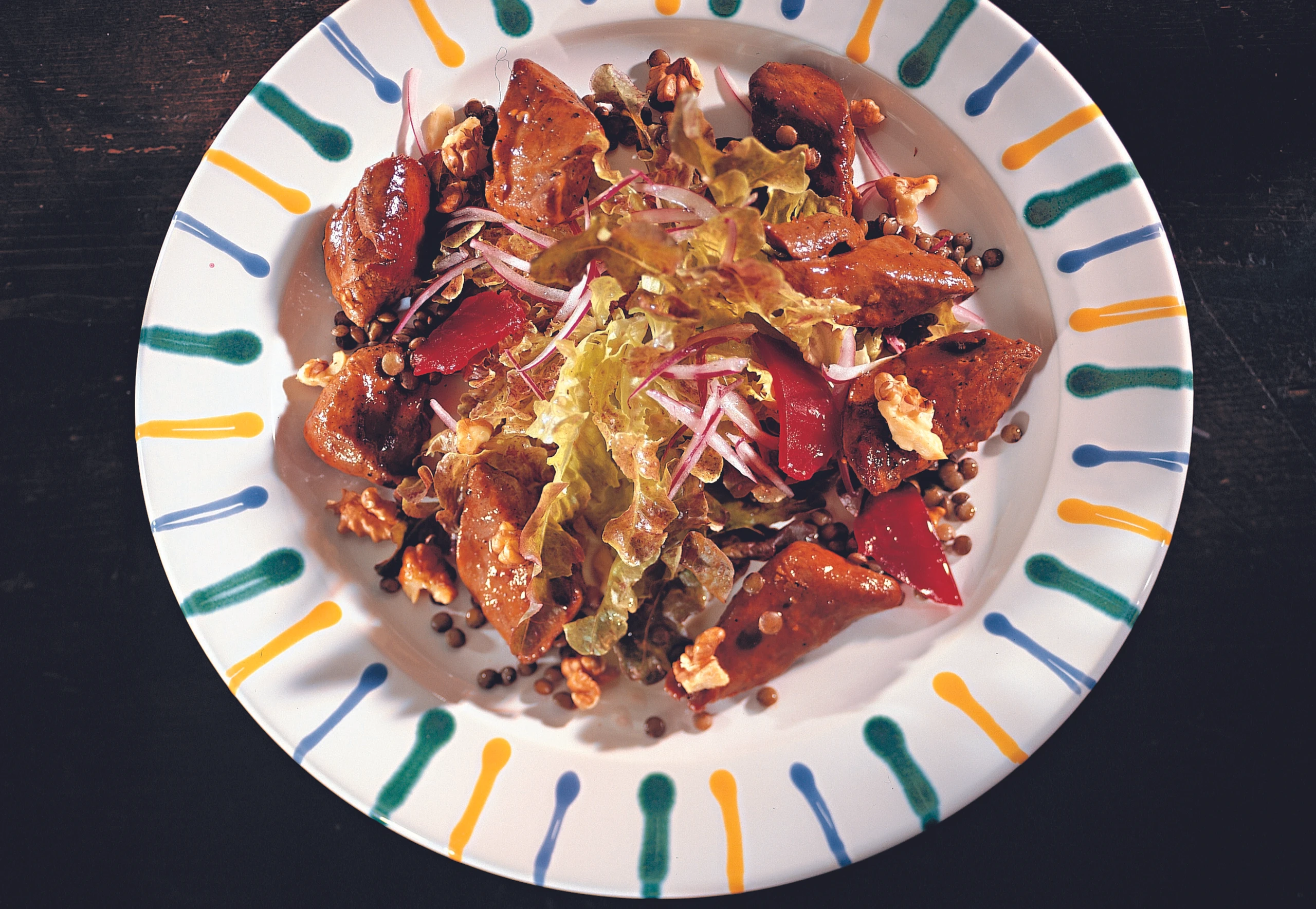 Für die Marinade Essige mit Salz, Pfeffer und Zucker würzen, Nussöl unter Rühren zugießen. Linsen, Rotkraut und Eichblattsalat getrennt mit je einem Drittel der Marinade vermischen. Rotkraut mit wenig Zimt verfeinern. Salate auf Tellern anrichten. Die Hasenfilets in gleich dicke Scheiben schneiden, auf den Salaten anrichten und mit Walnusskernen bestreuen.