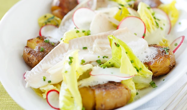 - Erdäpfel in je 1 EL Öl und Butter hell anbraten, mit Kümmel und Thymian würzen. Salat marinieren. Filets mit den Beilagen anrichten.